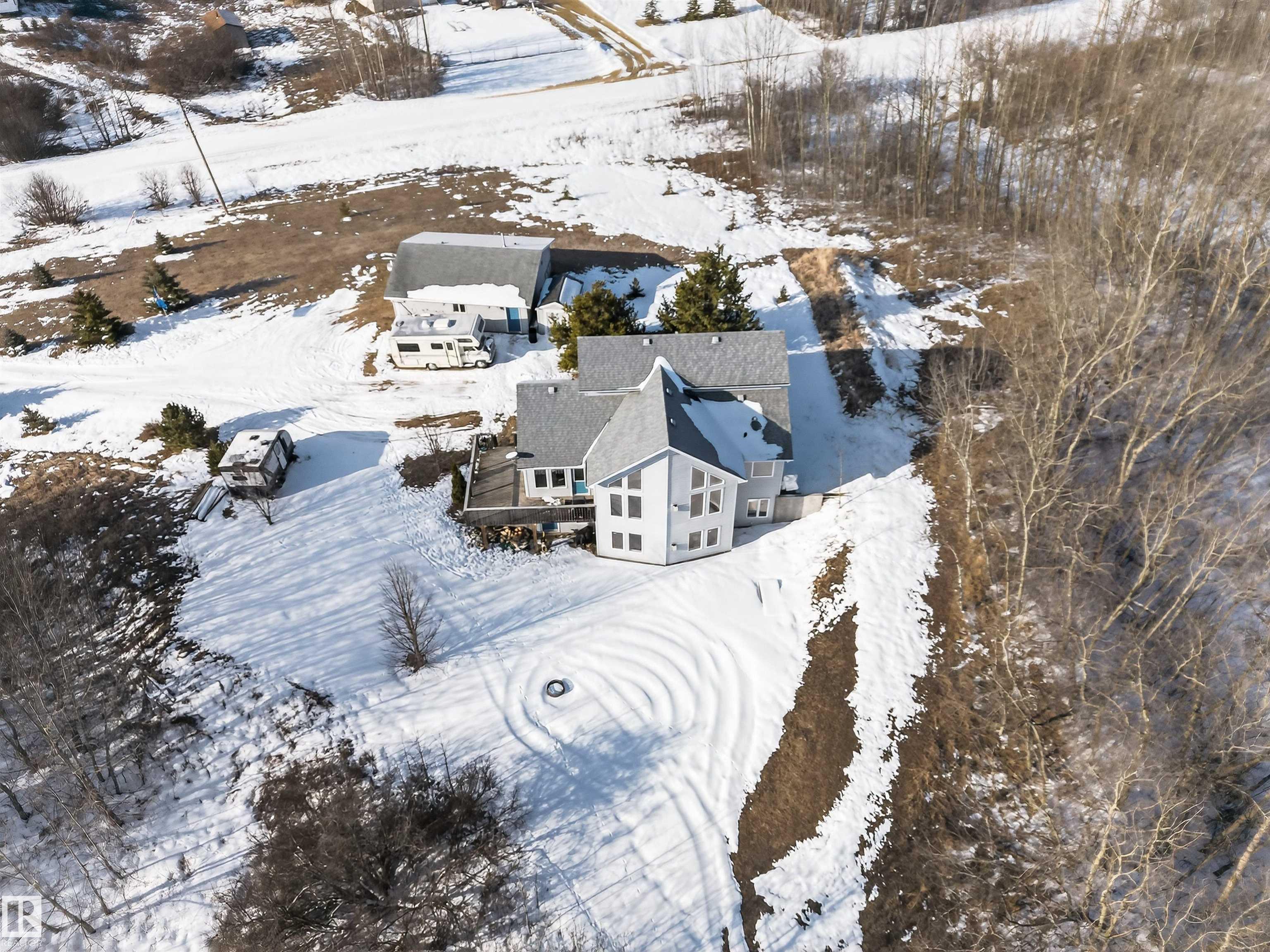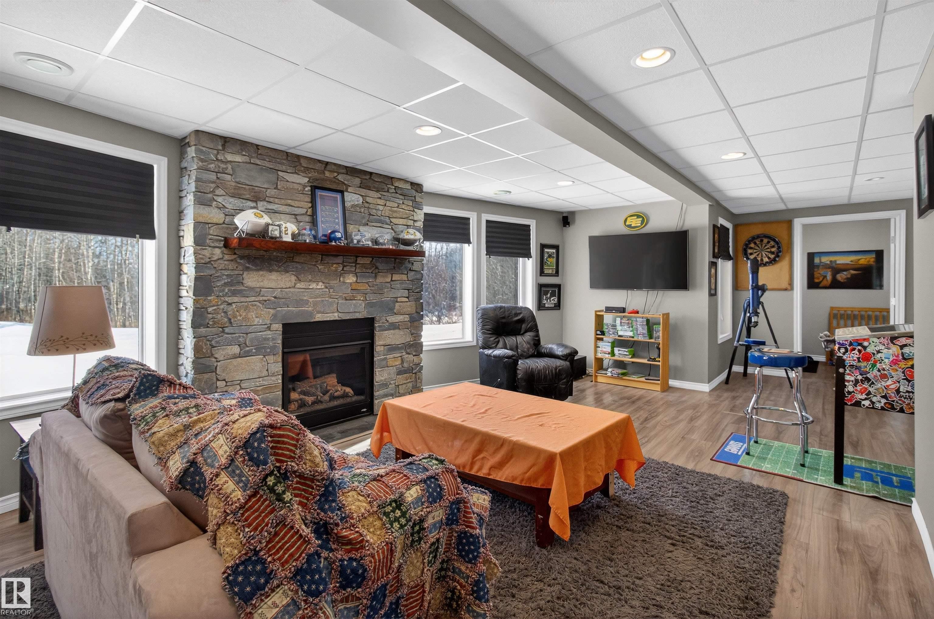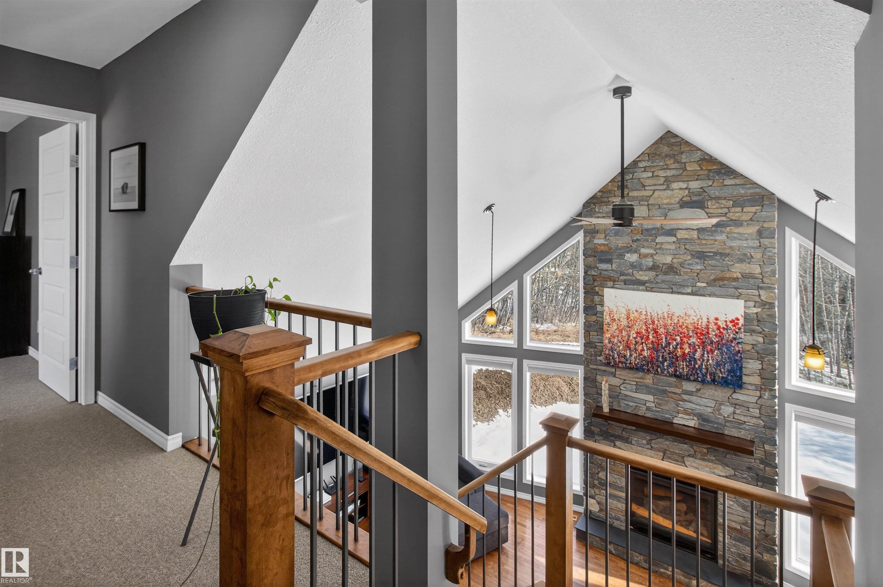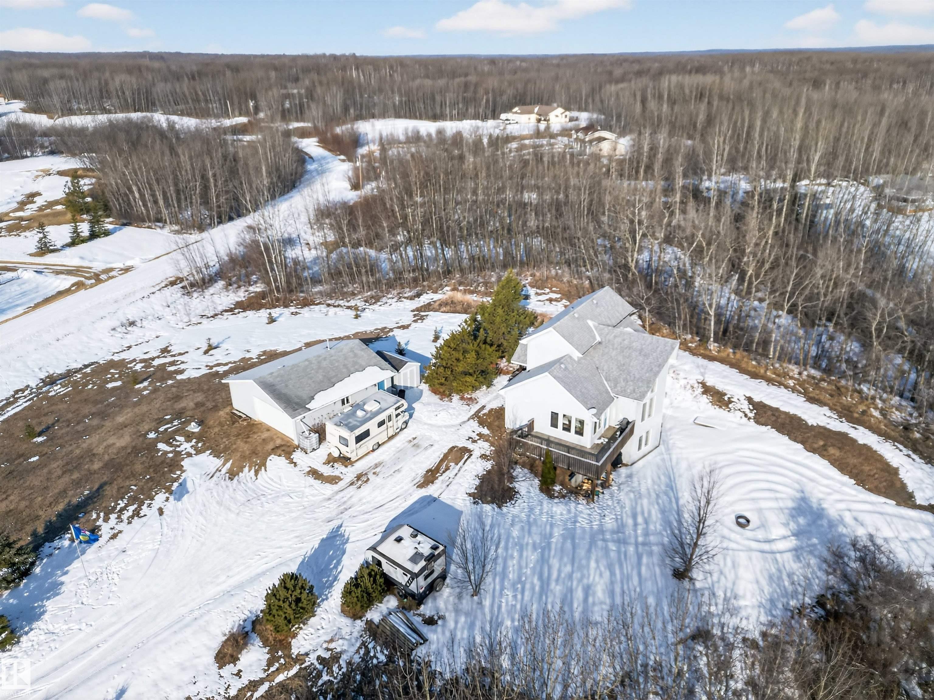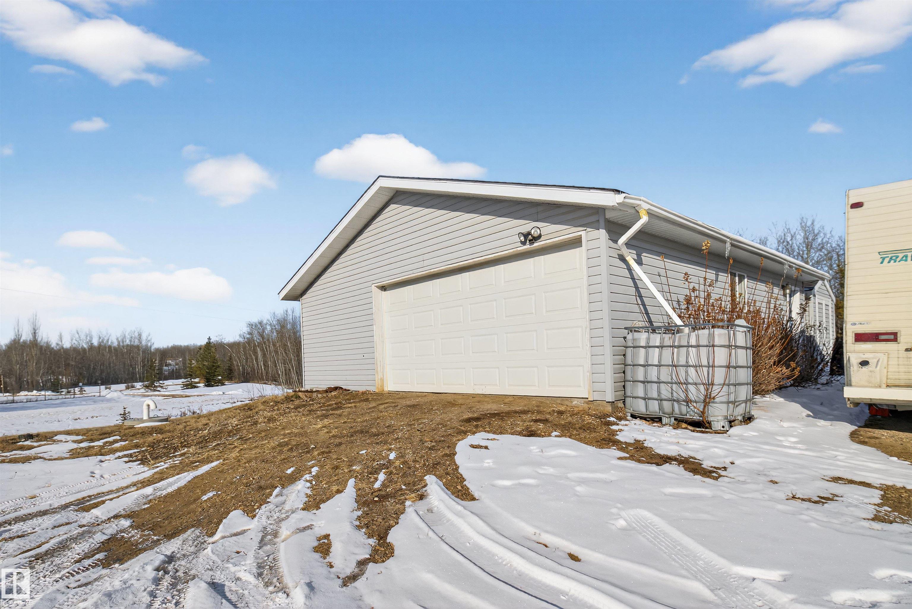 Private country residential retreat offering space, comfort, and thoughtful design. This inviting home features soaring vaulted ceilings and an open-concept kitchen and living room, highlighted by a stunning feature wall with a cozy gas fireplace. The main floor hosts a spacious primary bedroom complete with a four-piece ensuite. Upstairs, you'll find two additional bedrooms and a well-appointed four-piece bath--perfect for family or guests. The fully developed walkout basement adds exceptional living space, including a second gas fireplace, an additional bedroom, and a convenient two-piece bath. Step outside to enjoy the peaceful surroundings and easy access to nature. Car enthusiasts and hobbyists will appreciate the oversized double detached garage--fully heated and uniquely equipped with its own four-piece bathroom and separate septic system. A rare blend of rural charm and modern convenience.