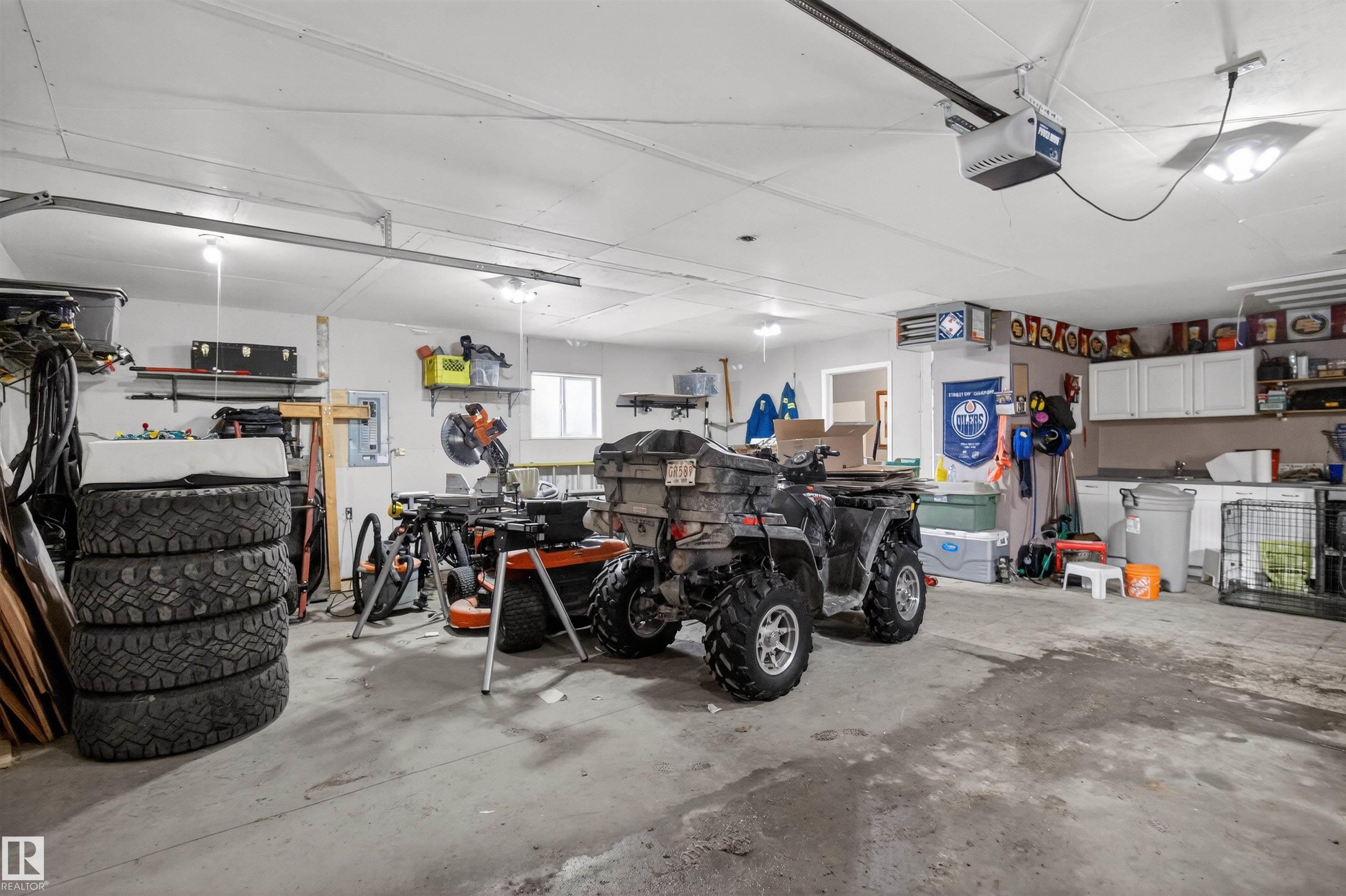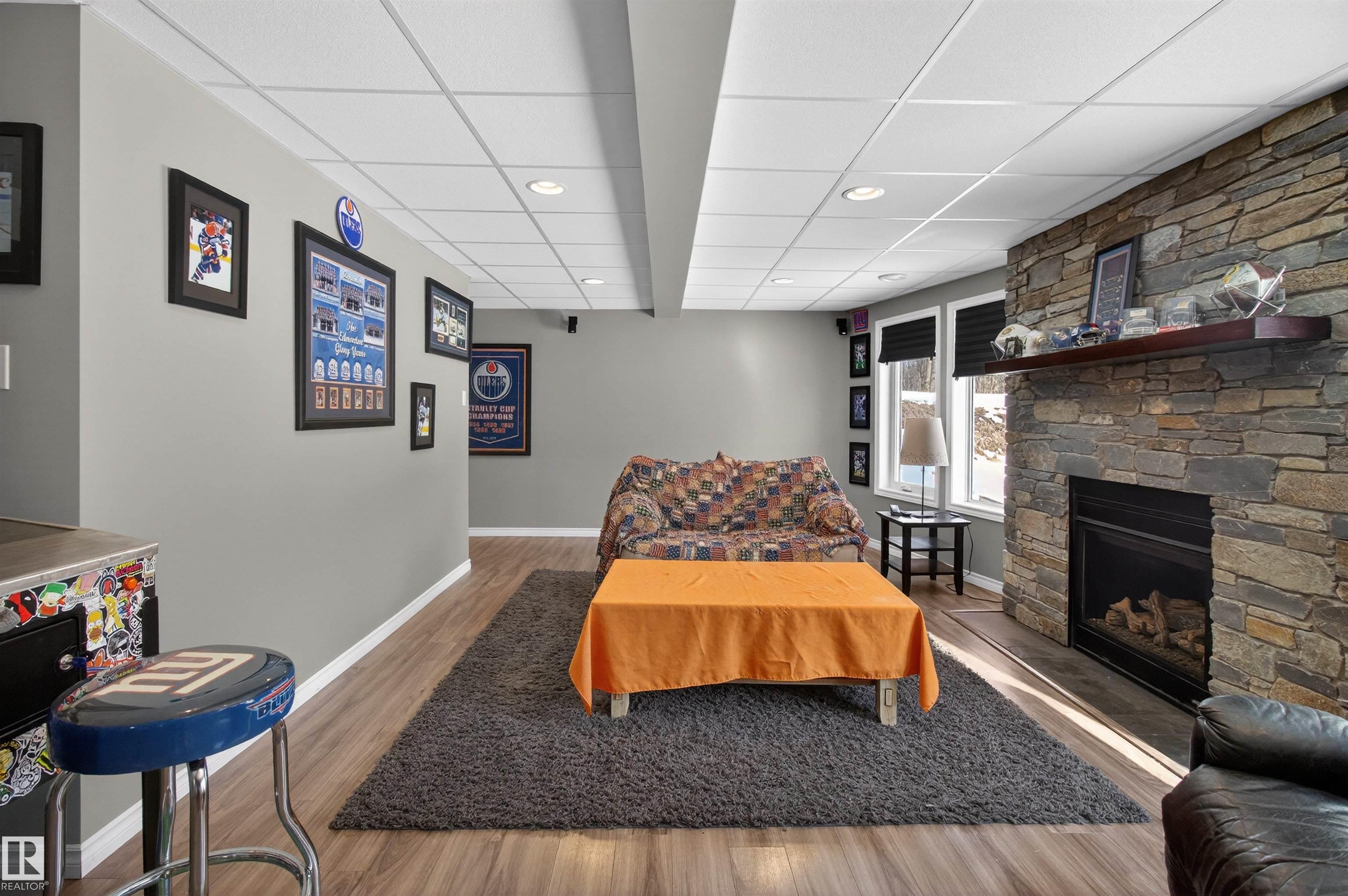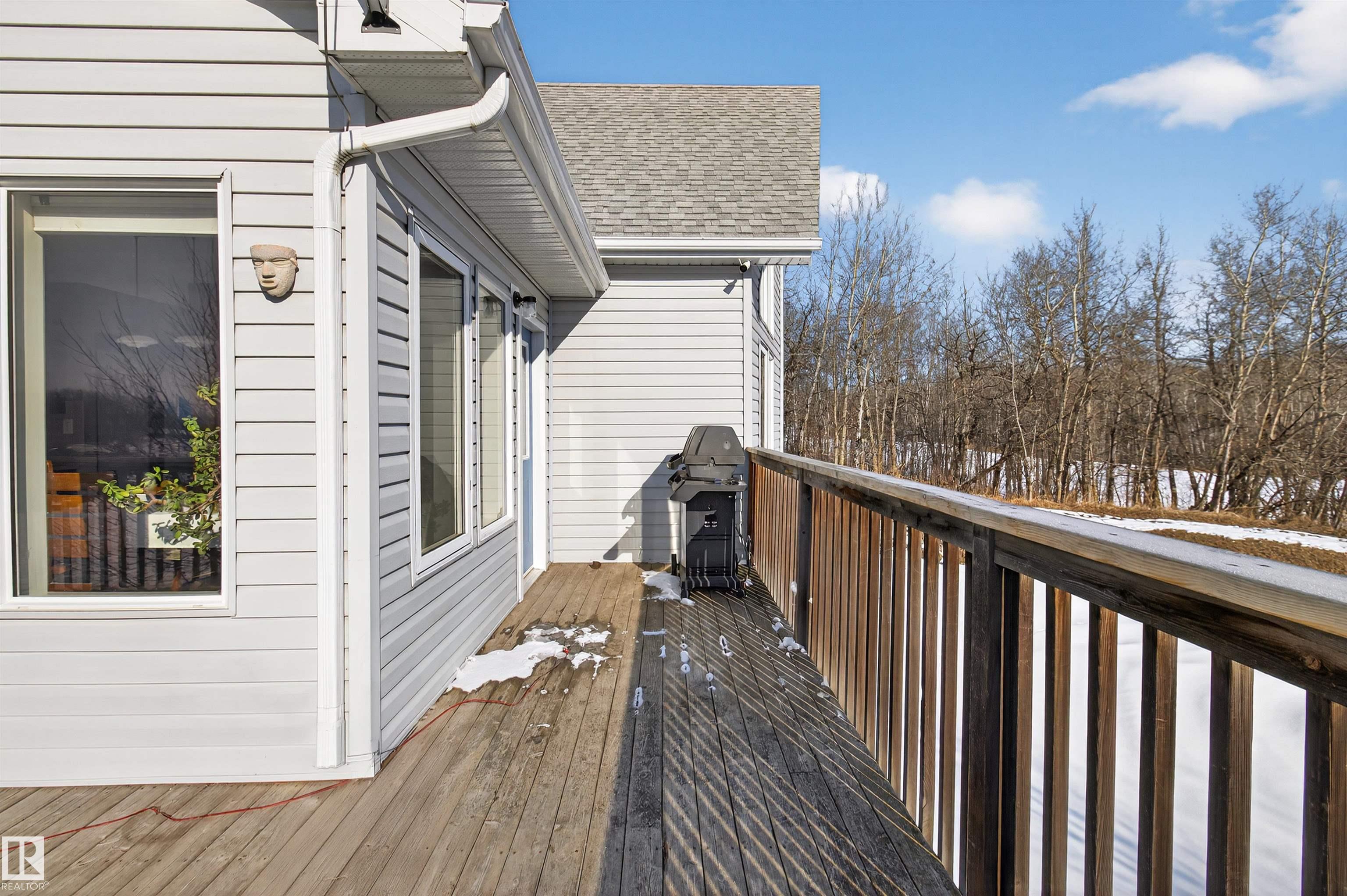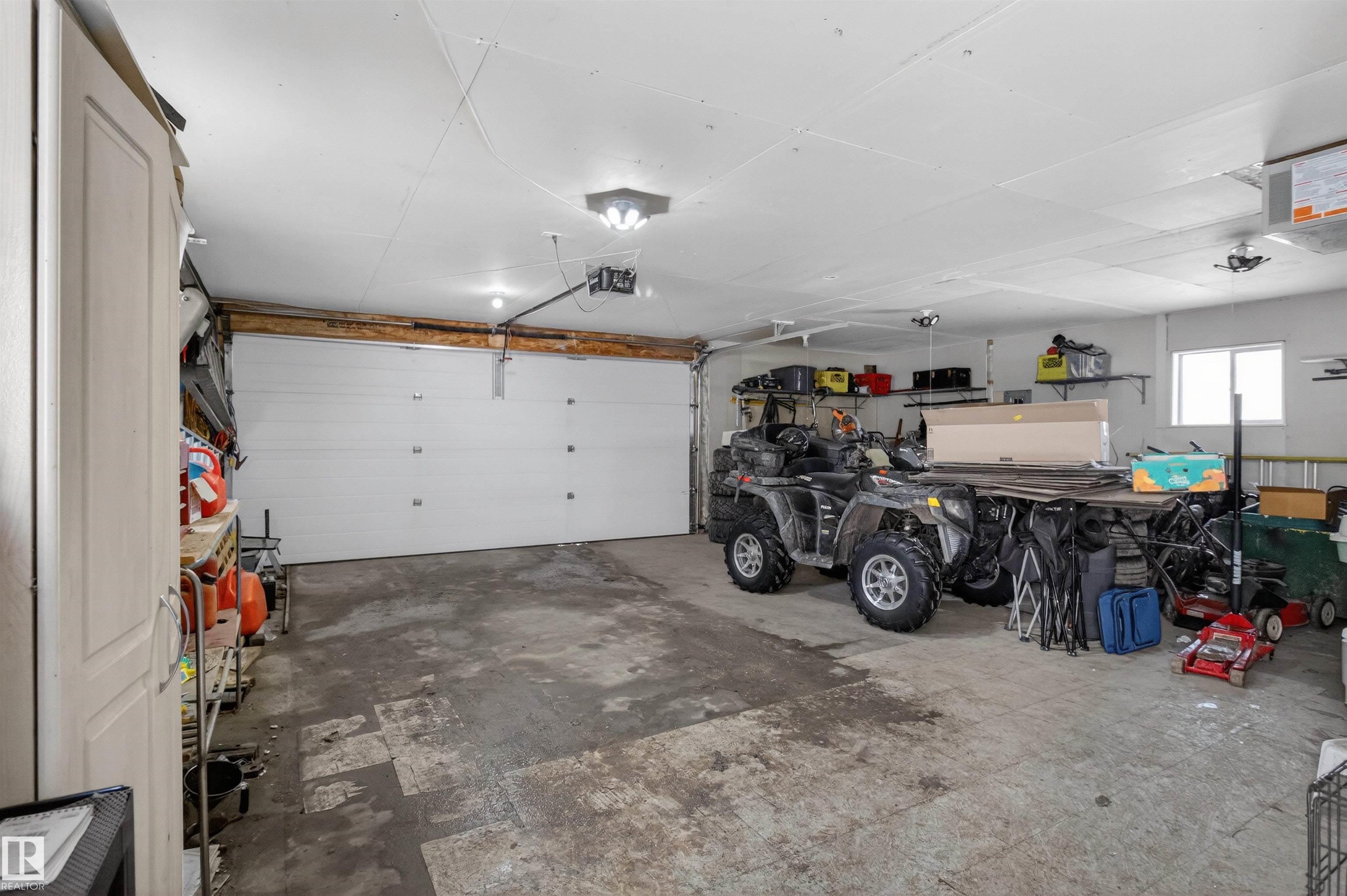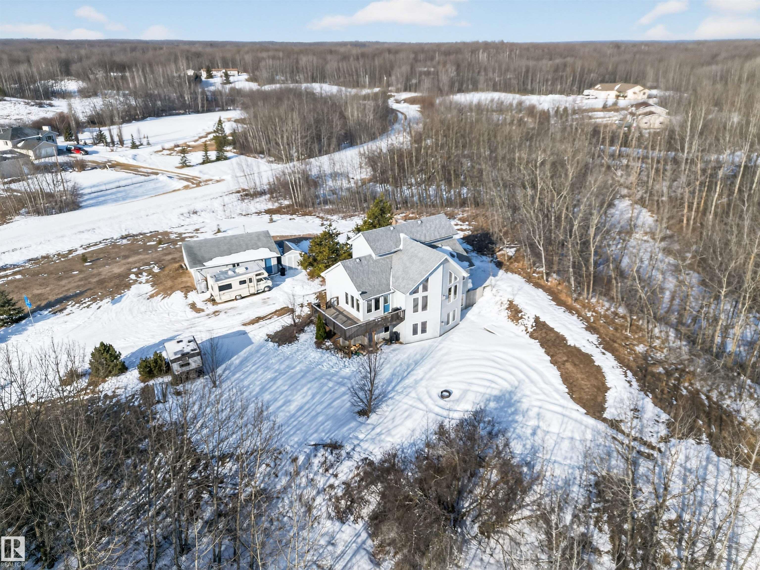 Private country residential retreat offering space, comfort, and thoughtful design. This inviting home features soaring vaulted ceilings and an open-concept kitchen and living room, highlighted by a stunning feature wall with a cozy gas fireplace. The main floor hosts a spacious primary bedroom complete with a four-piece ensuite. Upstairs, you'll find two additional bedrooms and a well-appointed four-piece bath--perfect for family or guests. The fully developed walkout basement adds exceptional living space, including a second gas fireplace, an additional bedroom, and a convenient two-piece bath. Step outside to enjoy the peaceful surroundings and easy access to nature. Car enthusiasts and hobbyists will appreciate the oversized double detached garage--fully heated and uniquely equipped with its own four-piece bathroom and separate septic system. A rare blend of rural charm and modern convenience.