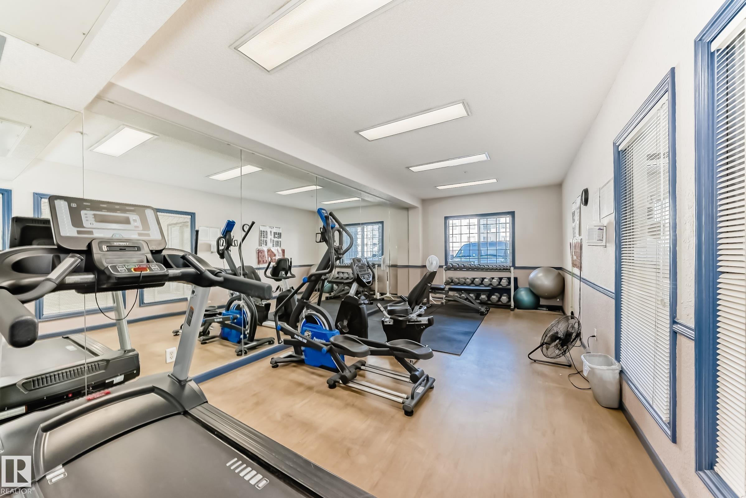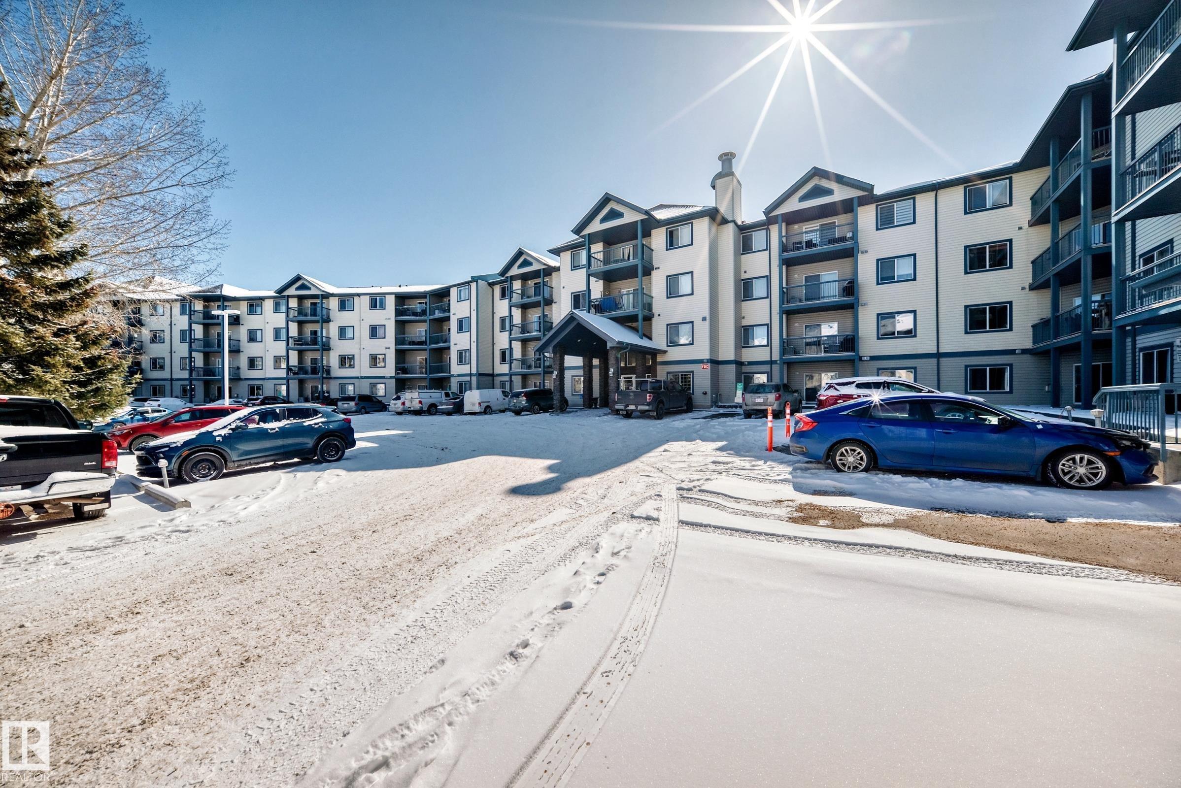 Welcome to this beautifully maintained main floor unit offering over 1000 sq ft of thoughtfully designed living space. Featuring 2 bedrooms and 2 full bathrooms, including an ensuite with a relaxing jacuzzi tub. This home showcases pride of ownership from the original owner. The interior has been professionally painted and features engineered hardwood flooring throughout, with ceramic tile in the entry and bathrooms. The kitchen is finished with quartz countertops, ceramic backsplash, and a moveable island with seating. Enjoy the cozy gas fireplace, in-suite laundry with oversized stackable washer/dryer, and air conditioning for year-round comfort. This home includes 2 titled parking spaces, a powered stall, plus an additional heated underground stall with storage. Building amenities include a gym, recreation room, library, guest suite, and outdoor gathering spaces. Ideally located near Namao shopping centre; grocery shopping, banks, transit, and quick access to the Anthony Henday and CFB Edmonton.