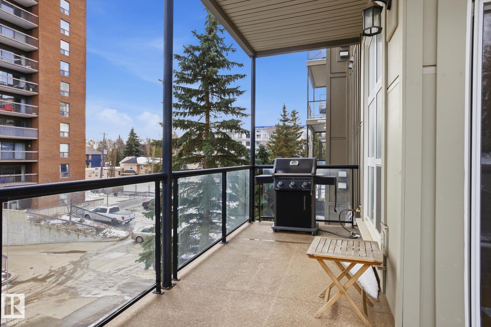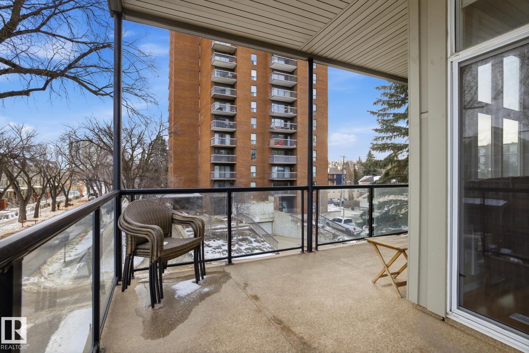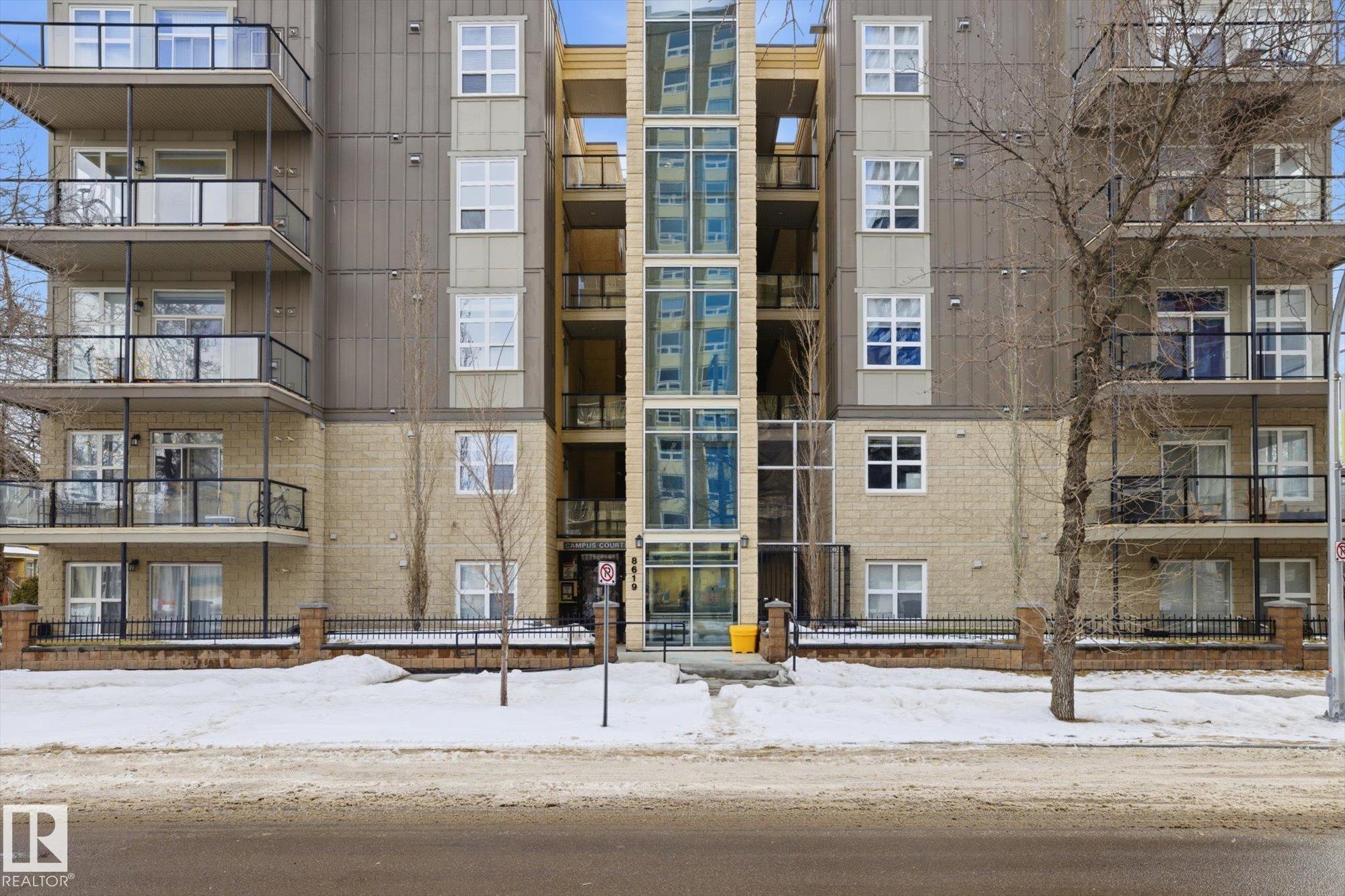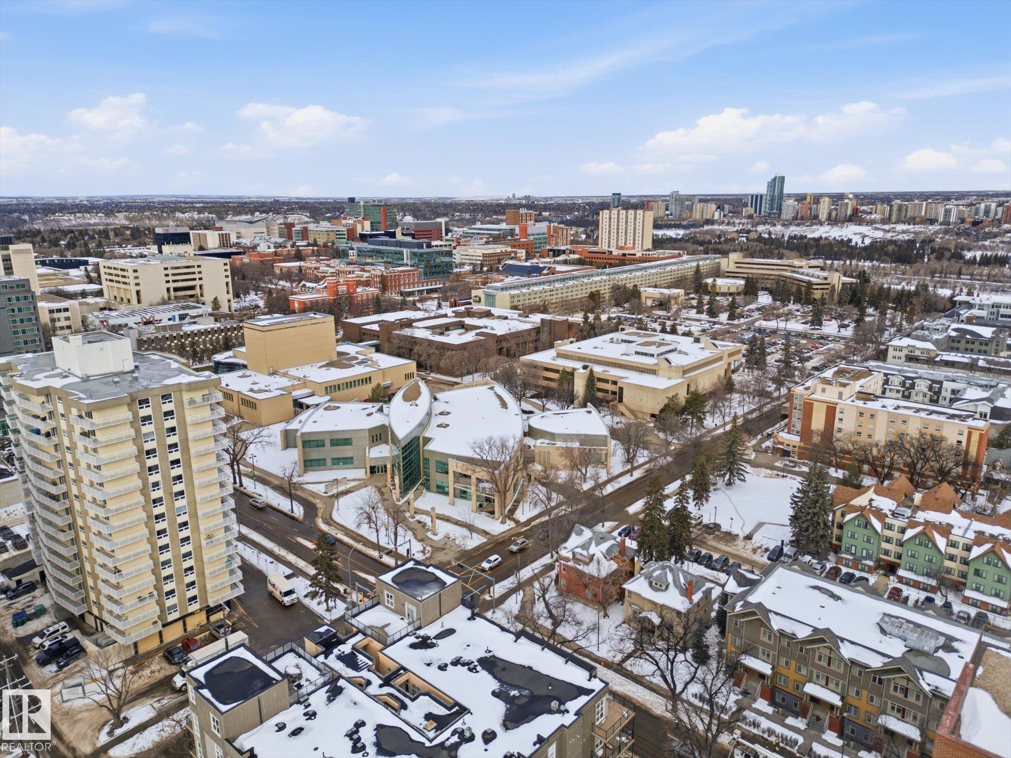 CENTRAL AIR CONDITIONING ~ AMAZING 2 BEDROOM, 2 FULL BATH CORNER UNIT ~ AMAZING TREE LINE & DOWNTOWN VIEWS ~ JUST STEPS TO UNIVERSITY of ALBERTA ~ HEATED UNDERGROUND PARKING with STORAGE CAGE ~ WRAP AROUND BALCONY ~ Check out this well maintained corner unit in CAMPUS COURT. This very clean unit features maple cabinetry, built in oven and counter top stove, raised eating bar and ton of cupboard space in the kitchen. Additionally, there are 10' ceilings throughout the unit which makes it feel bright and very open. The fridge, dishwasher, microwave and washer/dryer are all newer. The location is second to none and perfect for students or anyone who works at the University of Alberta or Whyte Avenue. The LRT is super close by and you can easily walk to Whyte Ave or the shops on 109 Street. The River Valley and downtown Edmonton are within blocks. The NE facing balcony is perfect to relax on and enjoy the morning sun plus there is a gas line for your BBQ. Nothing to do but move in and enjoy.