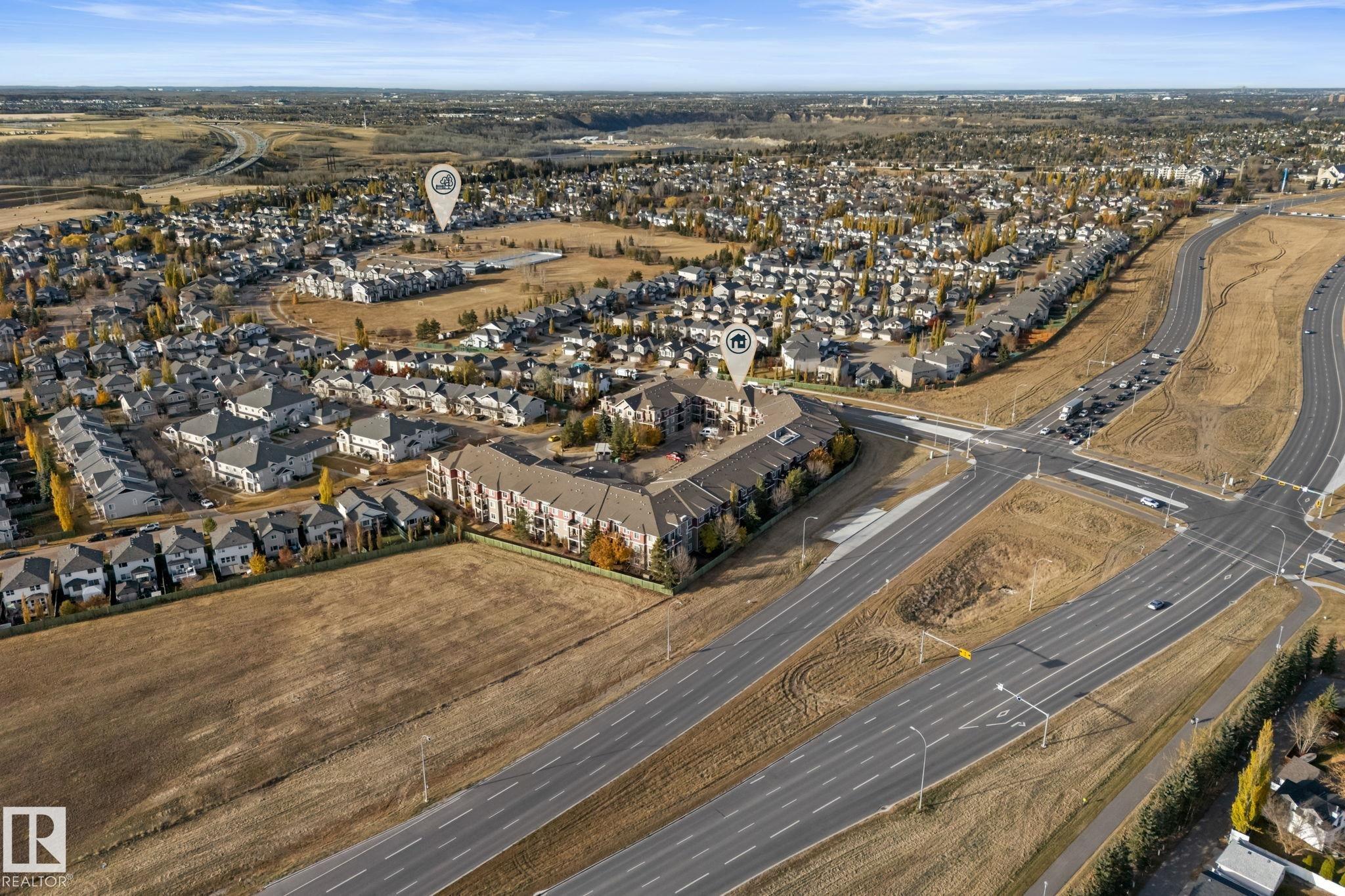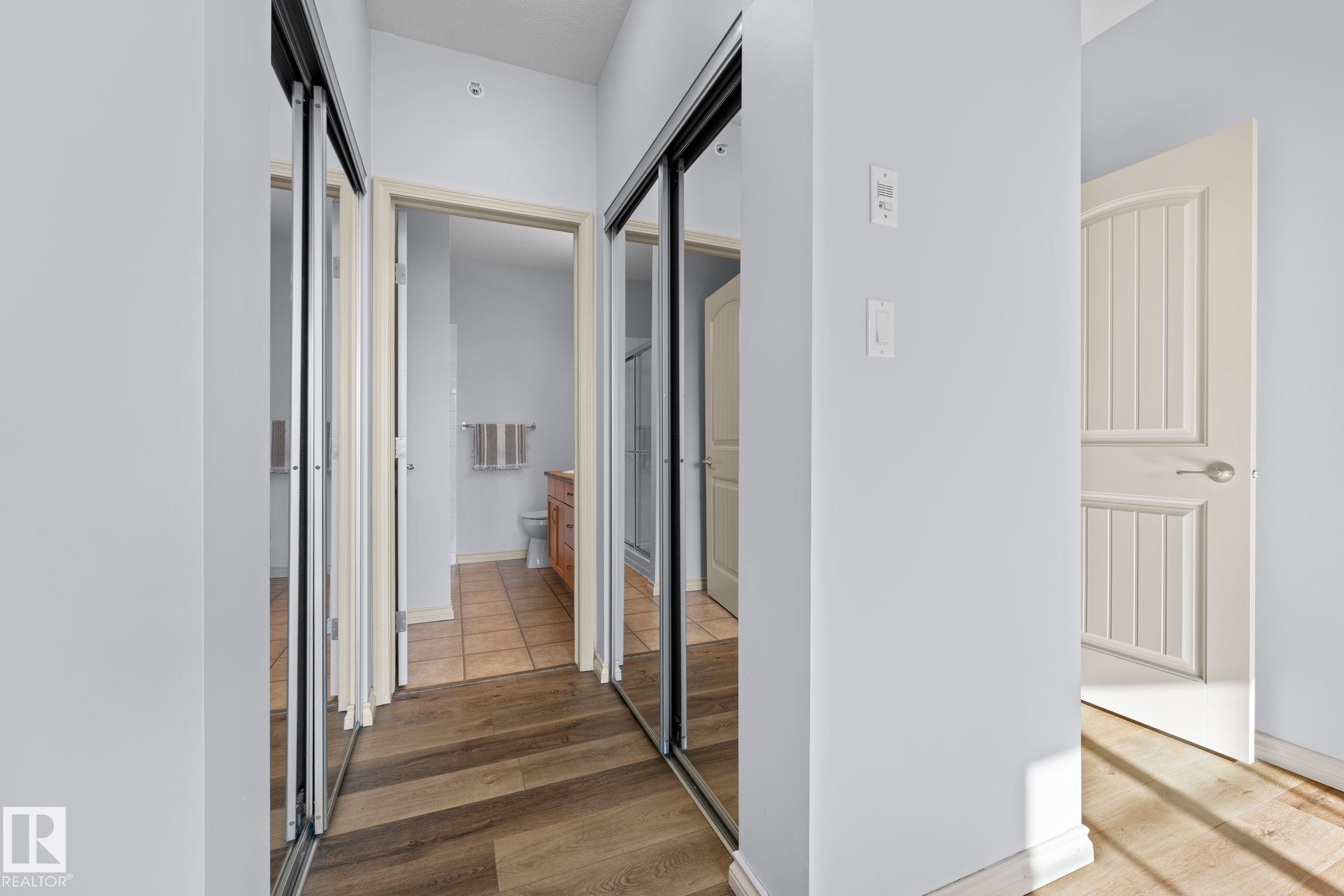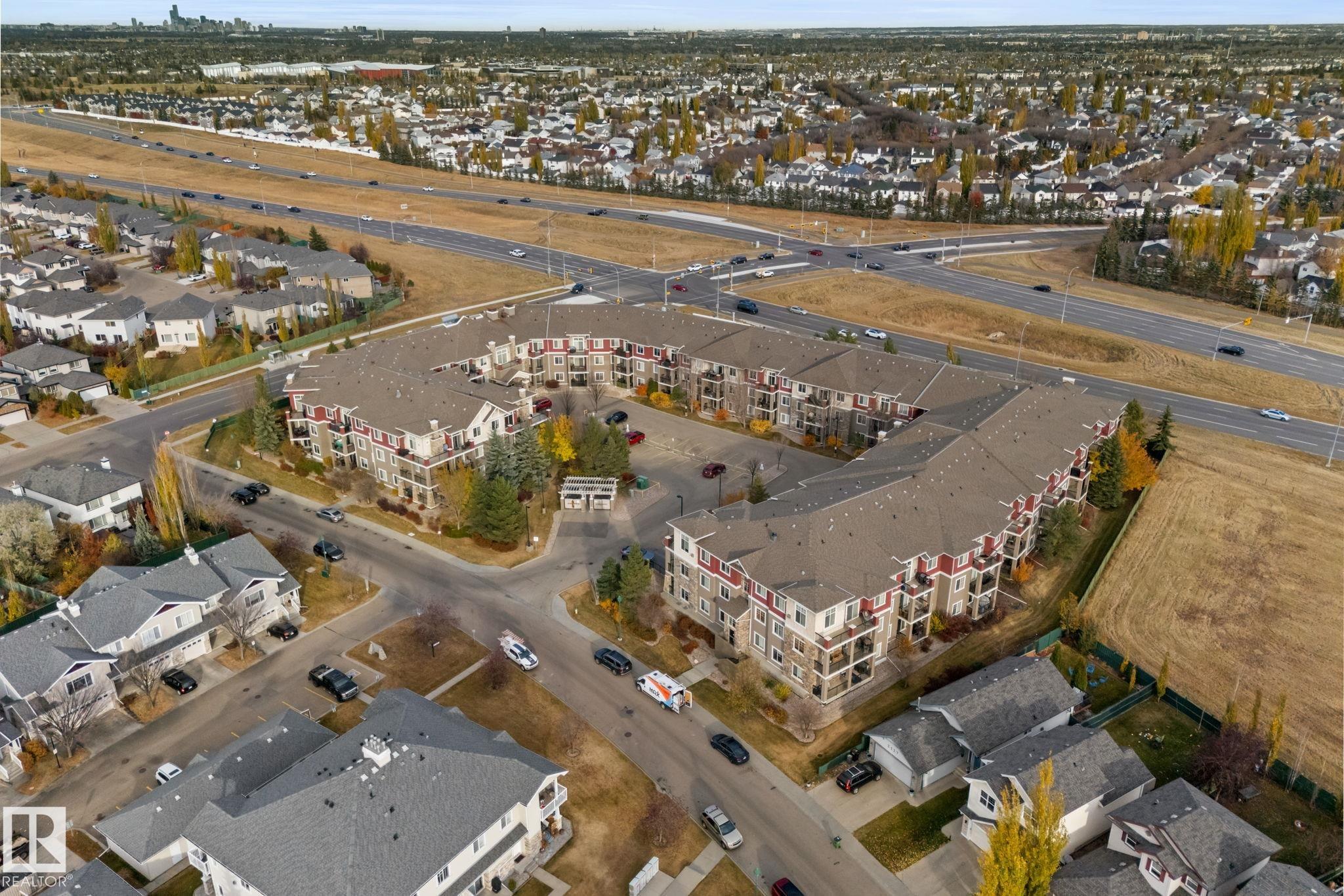 Rare offering, 3 bedroom, 2 bath top-floor corner unit w/ massive wrap-around southeast balcony. Extra large unit at over 1300 sq ft, vaulted 12-ft ceilings, a bright open-concept layout. The spacious primary suite is privately located away from the other bedrooms, easily fits a king bed, and includes dual walk-through closets and a 4-piece ensuite with double sinks and a walk-in shower. This immaculate unit offers newer flooring (no carpet), A/C, gas fireplace, gas BBQ hookup. The kitchen, dining, and living areas flow seamlessly, creating an airy, light-filled space perfect for entertaining. Large laundry room w/ extra storage, 2 titled heated underground parking stalls (one beside the elevator and one beside the stairwell), and storage locker. Condo fees incl. heat, water, and sewer. Pet-friendly building offers premium amenities: fitness room, theatre, games lounge, guest suite, and car wash bay Situated, within minutes of major shopping, dining, and quick access to the Anthony Henday.