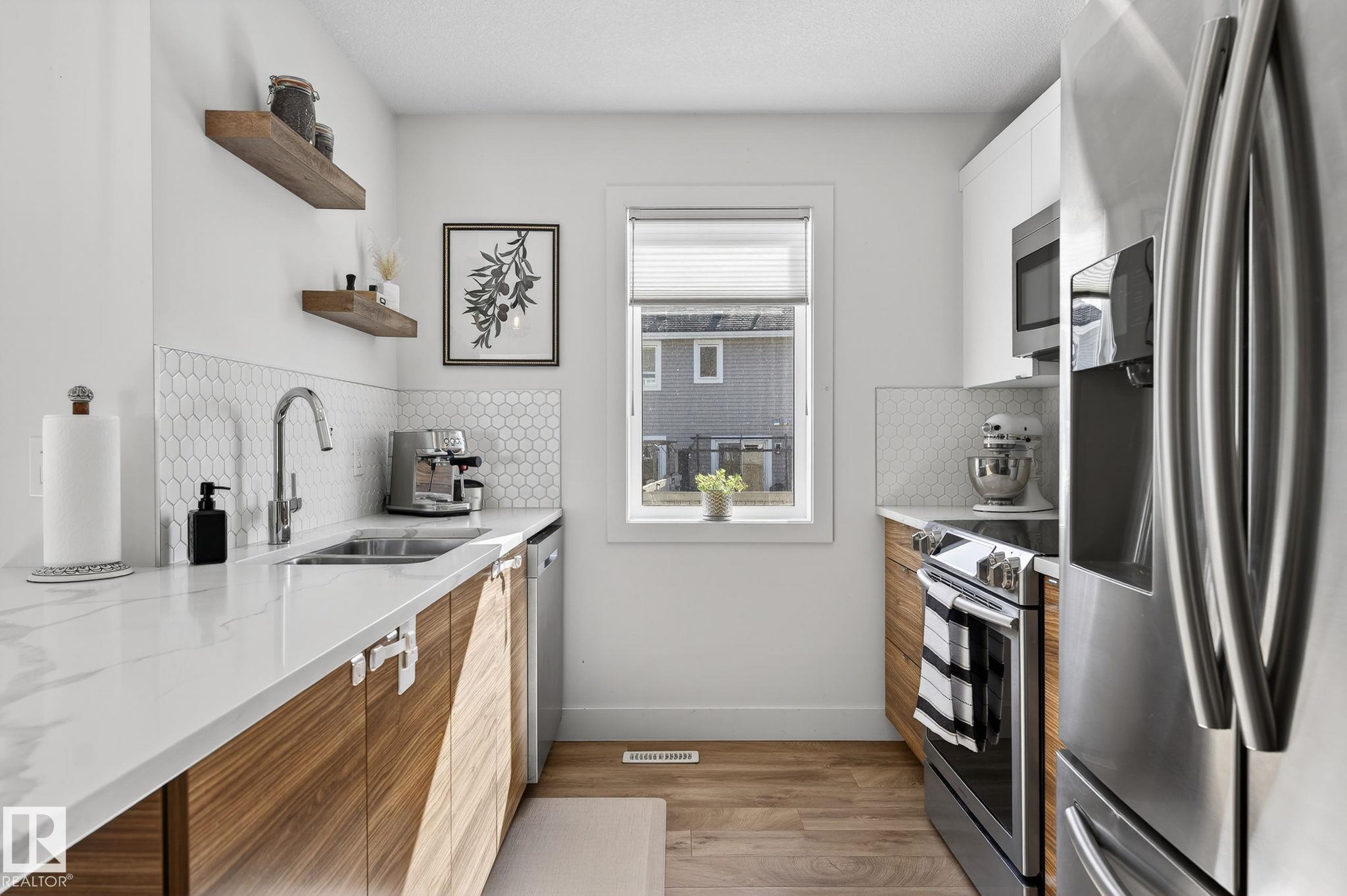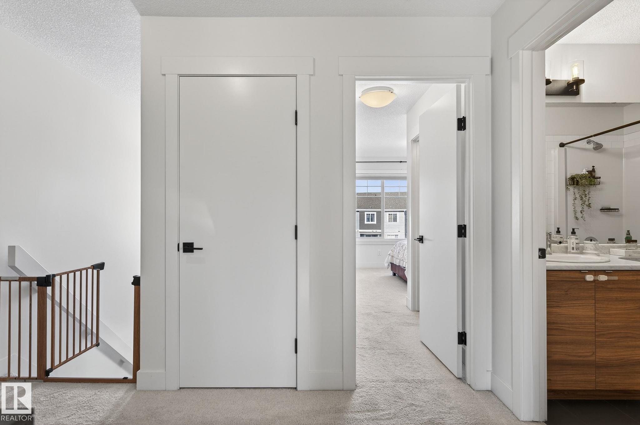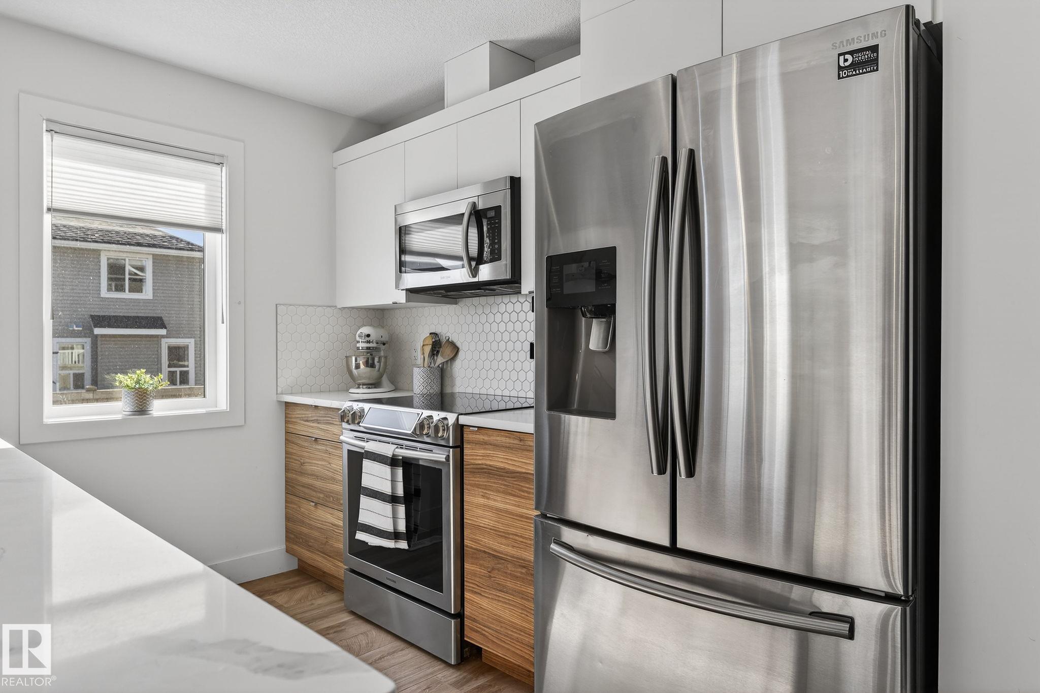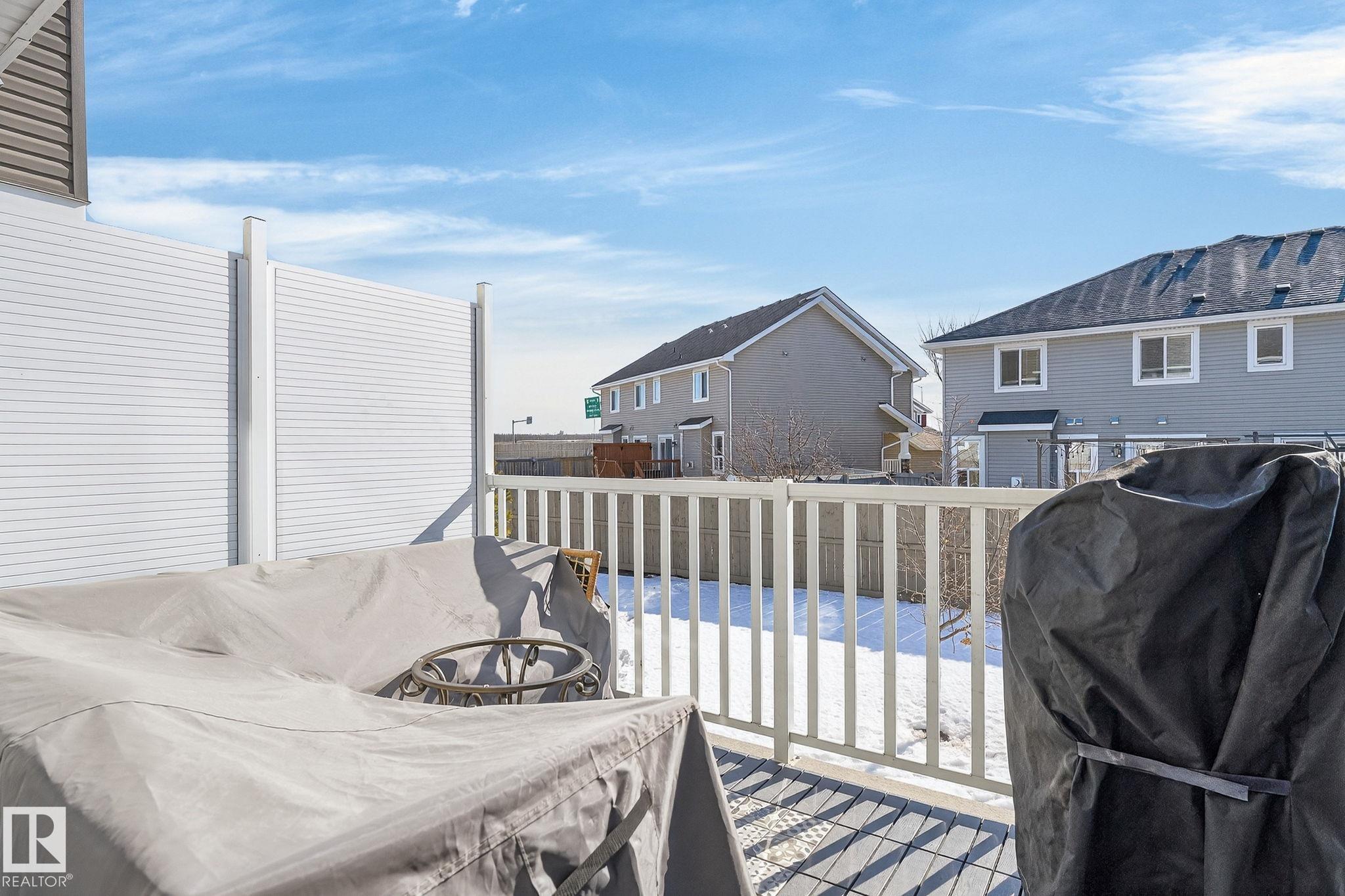 Step into this spacious and inviting 3-bedroom townhome, thoughtfully designed for family living. The generous living room offers a perfect place to relax, while the large dining area easily accommodates an 8-person table, ideal for entertaining. The open-concept layout flows into the elegant kitchen, complete with an eating bar/island, stainless steel appliances, and stylish cabinetry. This home features three well-appointed bathrooms, including a main-floor powder room, a 4-piece bathroom on the second level, and a 4-piece ensuite in the primary bedroom. The spacious primary suite fits a king-size bed and includes large double closets, while two additional bedrooms are bright and generously sized with large windows that bring in plenty of natural light. A tandem double attached garage offers ample space for vehicles, storage, and recreational gear. Ideally located near the Enjoy Centre, St. Albert, and the Anthony Henday, and across the street from Lois Hole Provincial Park, great for outdoor activities