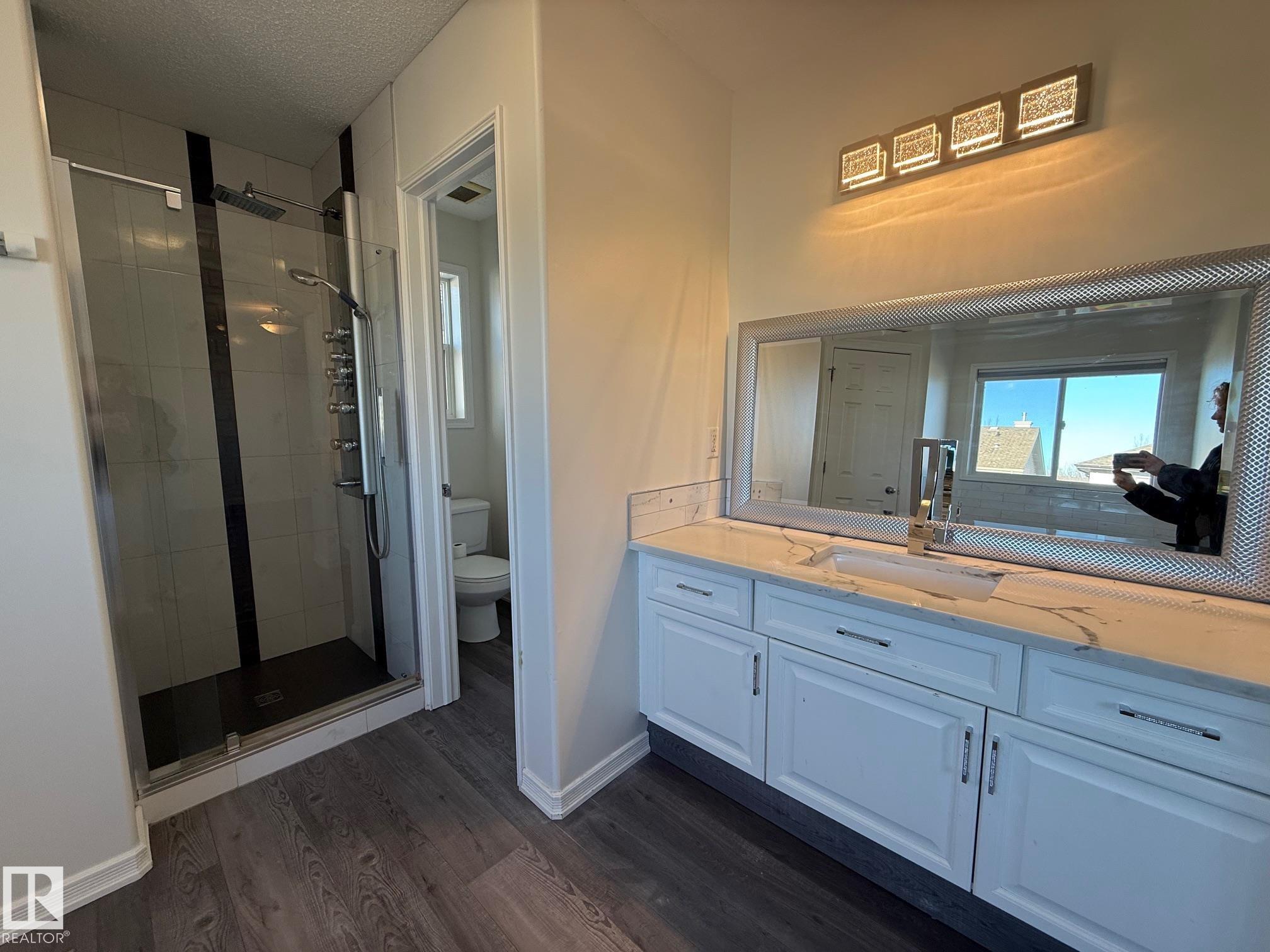 Welcome to your beautifully updated, move-in-ready family home in The Hamptons, West Edmonton! Freshly painted and thoughtfully designed for comfort and convenience, this home offers bright, open-concept living with a spacious kitchen, walkthrough pantry, and cozy fireplace in the great room--all kept comfortable year-round with central A/C. Upstairs features a versatile bonus room, upper-floor laundry, and three generous bedrooms, including a serene primary suite. With four full bathrooms and a fully finished basement offering an additional bedroom and living space, there's room for everyone. Enjoy outdoor living on the large entertaining deck overlooking the landscaped backyard, plus the convenience of an attached garage with mudroom access. Set in a quiet, family-friendly community with parks, trails, and quick access to Anthony Henday, West Edmonton Mall, and nearby schools--this is the perfect blend of comfort, location, and lifestyle. Ready to move in and start living!