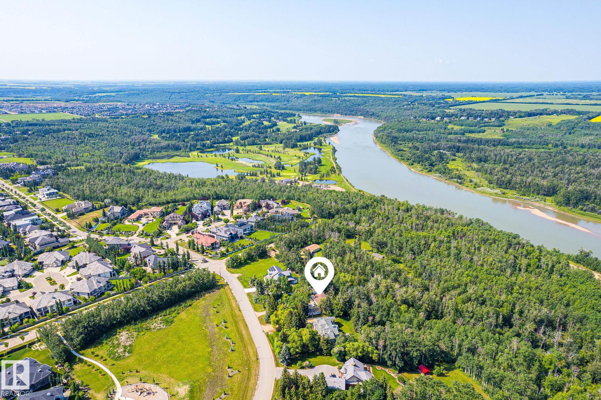Prestigious country-living right in the city with the opportunity to build your dream home without any compromises. WALKOUT BASEMENT home, a private and secluded PANORAMIC VIEW of the river, river valley and River Ridge golf course, high atop the banks of the North Saskatchewan River. 4,837.10 m2 / 1.2 acres beautiful park like acreage. 4 Bedrooms, 3 Baths. Master with Ensuite and oversized private outdoor deck with the most EXQUISITE VIEW! Main Floor includes large GREAT ROOM, DINING ROOM, KITCHEN and over 1,000 sq.ft deck. Lower WALKOUT level includes large family ROOM and GAMES ROOM & 4th BEDROOM. Triple car garage! No walking trail at the back for extra privacy. One of the best lots in the city. A must see.