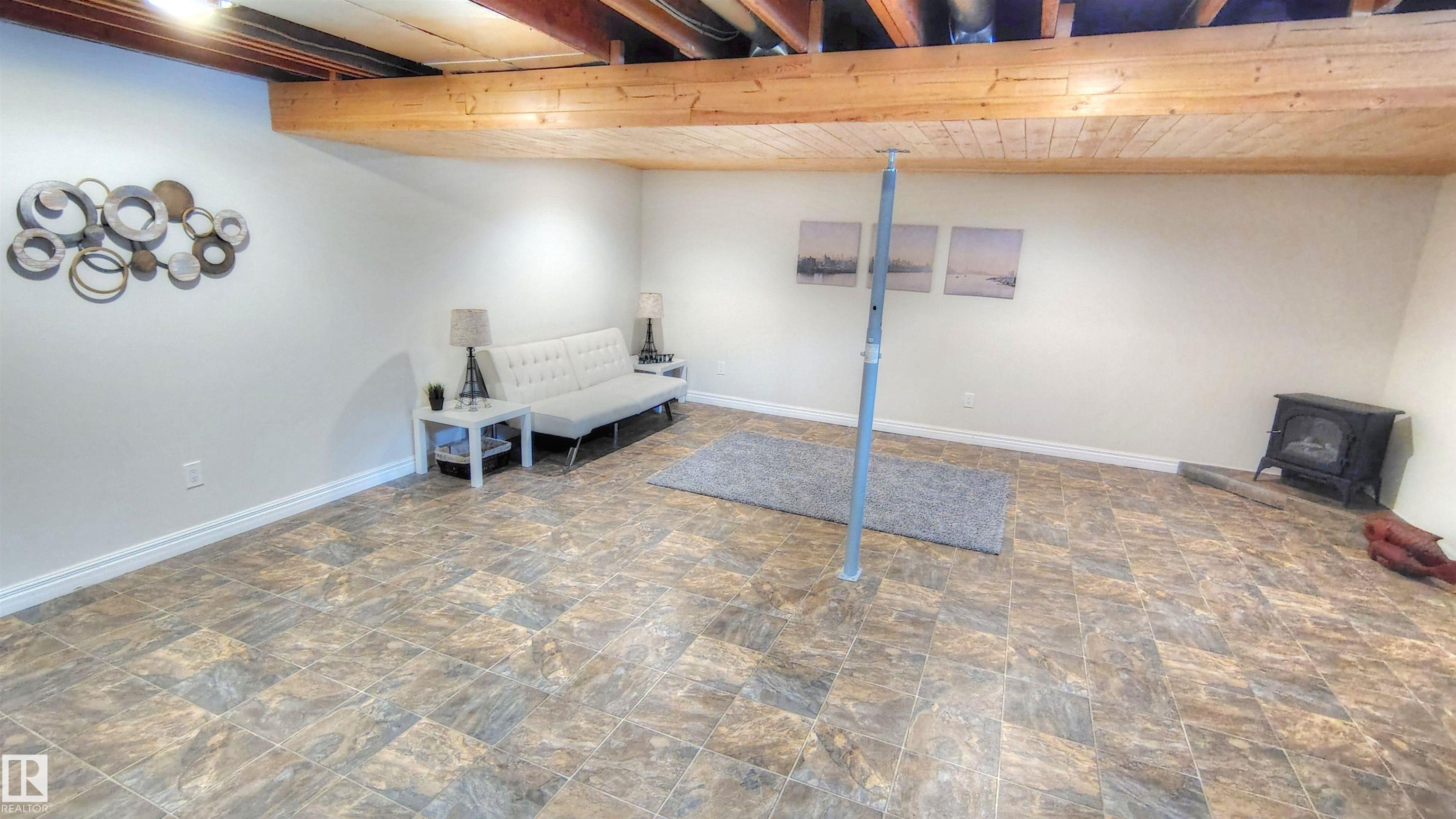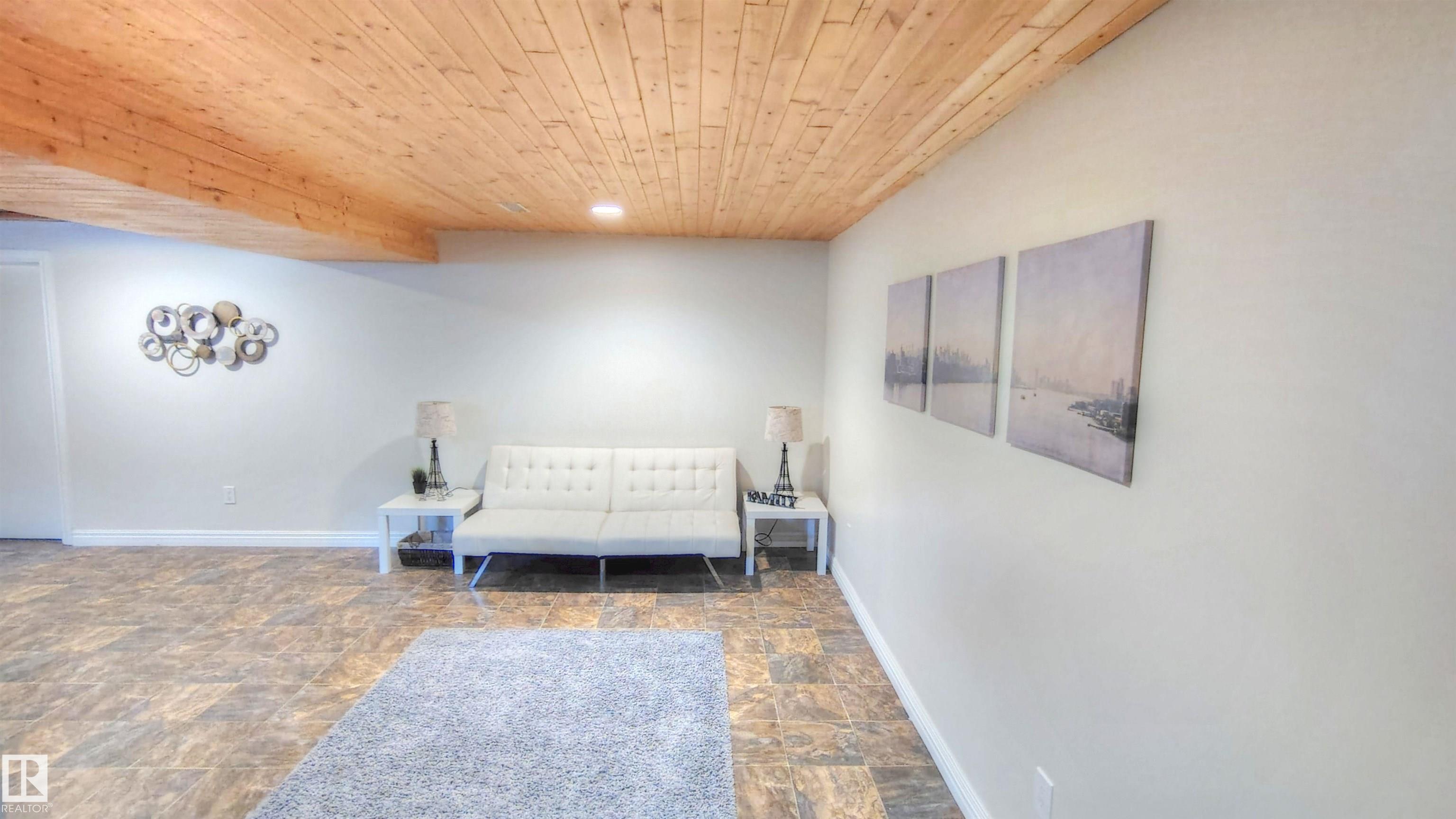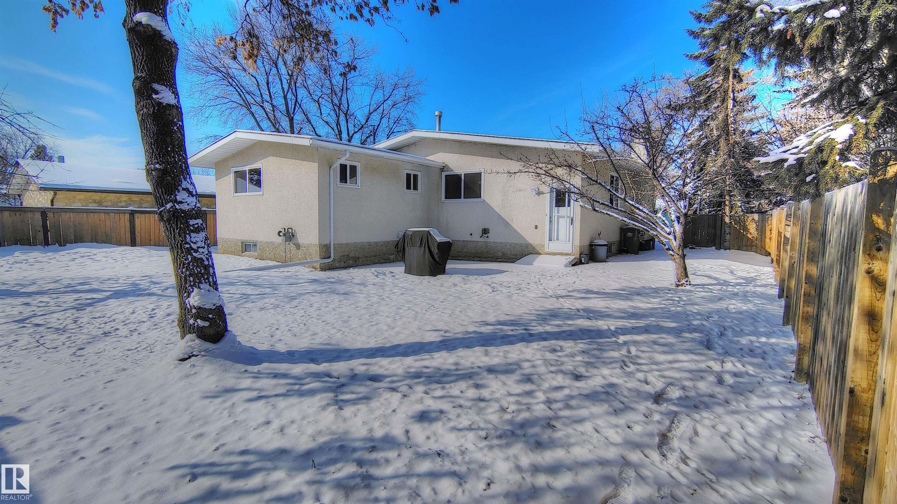 A REFINED RESIDENCE OF CHARACTER & CONVENIENCE. Located in sought-after Akinsdale w/ excellent connectivity & mins to the Henday, this 3+1 bed, 3 bath bungalow offers a considered interior & striking curb appeal. Updated w/ premium siding & hand-finished cultured stone, the front elevation impresses. A rare find, the property features a double attached garage w/ direct internal access. The main floor is defined by architectural vaulted timber ceilings, a wood-burning fireplace & premium triple-pane windows. The bespoke kitchen features Italian-crafted high-gloss doors, walnut counters, 42" uppers, gold pulls, subway tile, under-cabinet LEDs, a pantry wall & integrated waste+spice pull-outs. Practicality meets luxury w/ main-floor laundry & a spa-inspired bath w/ heated bidet & towel warmer. PRINCIPAL SPECS: 64'x110' lot w/ Mature Fruit Trees; Basement w/ 4th Bed & Ensuite; Radon Mitigation <20 Bq/mü; Architectural Shingles (2018). Well-appointed interior w/ scope to add value via exterior personalization.