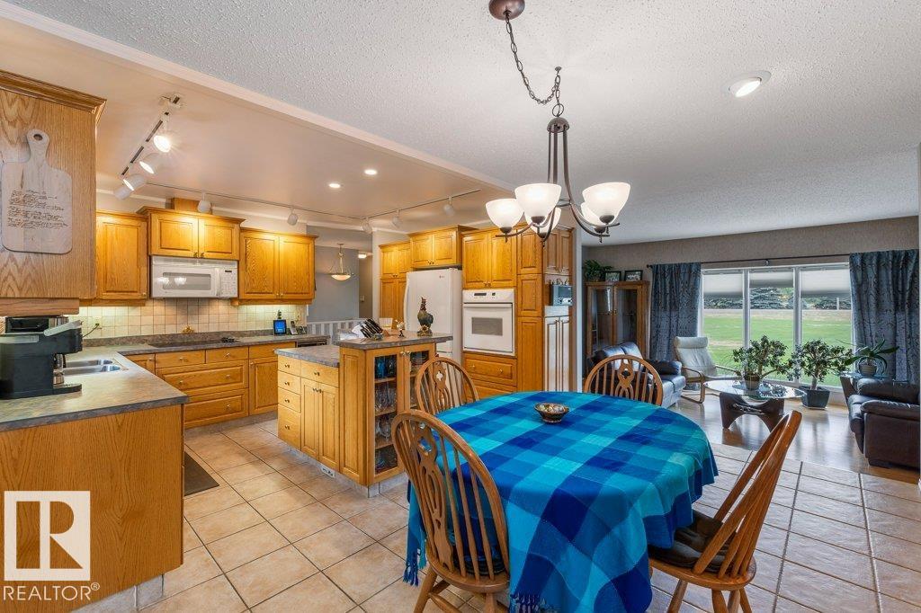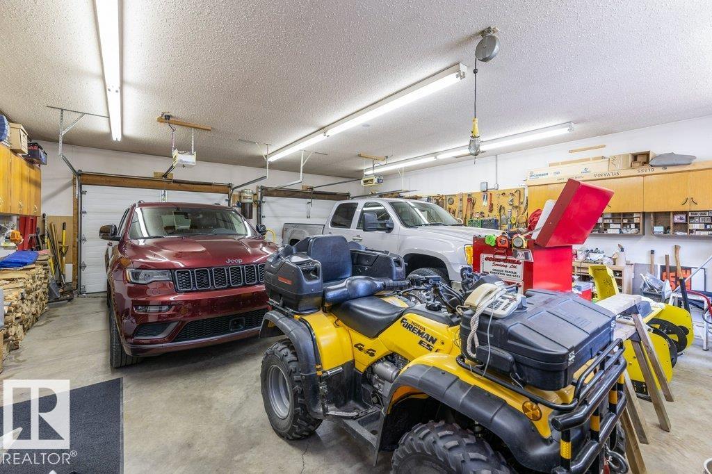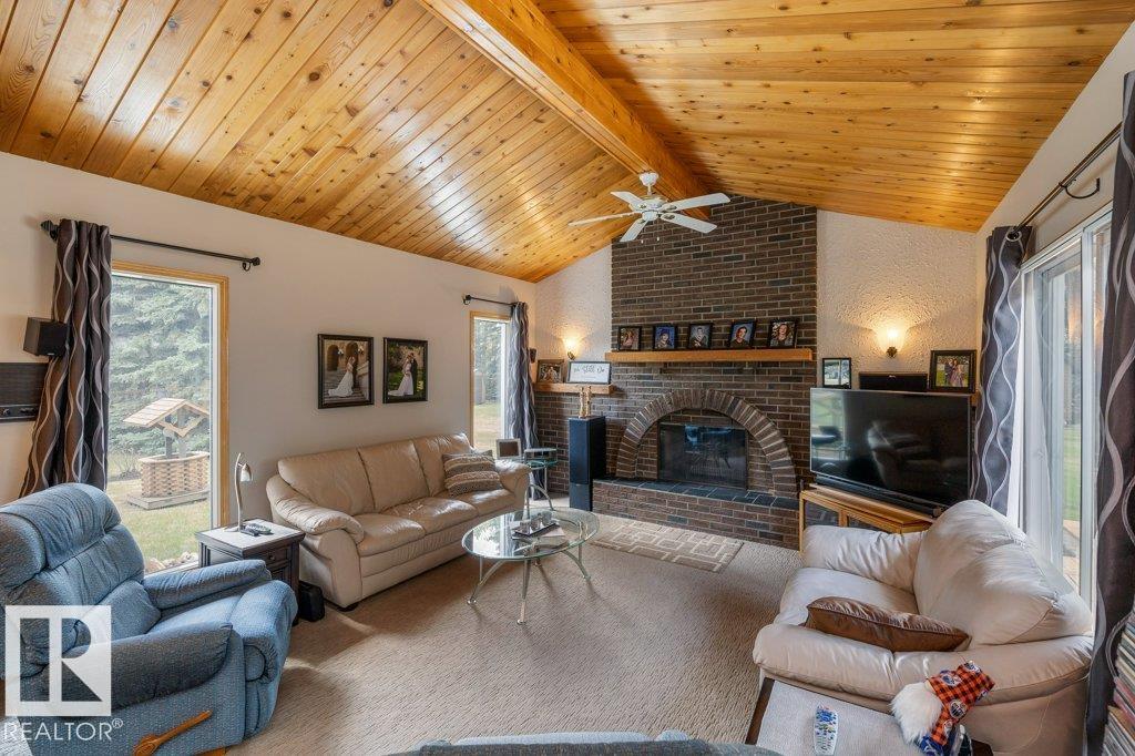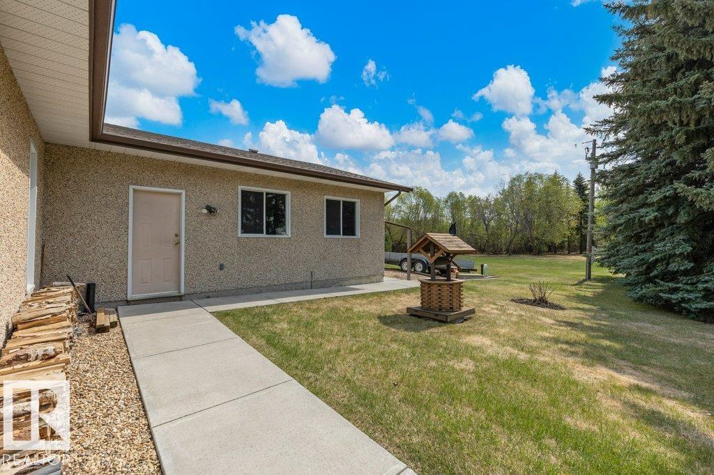 Beautifully maintained & extremely well cared for, this 1894 sq ft bungalow offers peaceful country living just 15 minutes west of St. Albert on 3 beautifully treed acres. Filled with natural light, the spacious LR features an abundance of windows, while the sunken FR showcases a cozy wood-burning FP. Spacious KI with island, abundance of countertop & cupboards & eating area. The main floor offers 3 generous bdrms, hardwood flooring, convenient main floor laundry & functional living spaces throughout. The partially finished basement includes a fourth bedroom, bathroom & a large recreation area with room to grow. The dream 29x24 oversized double tandem garage is heated & perfect for vehicles, hobbies & storage. Outside, enjoy a private, beautifully maintained yard with a firepit area, shed, RV parking & a large tiered deck ideal for entertaining. With plenty of space to build a shop or additional outbuildings, this property offers flexibility & lifestyle. Country living at its best an absolute must see!