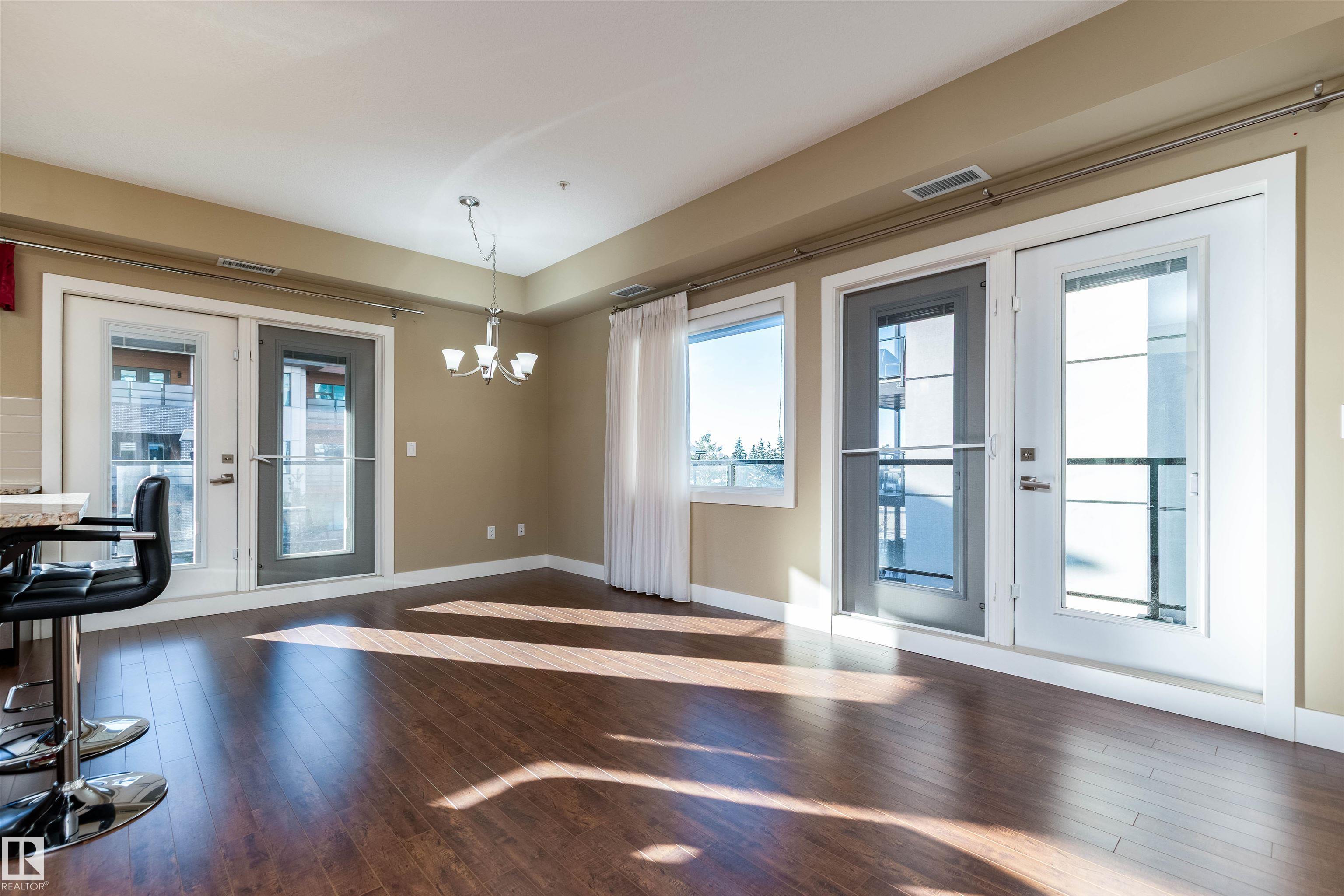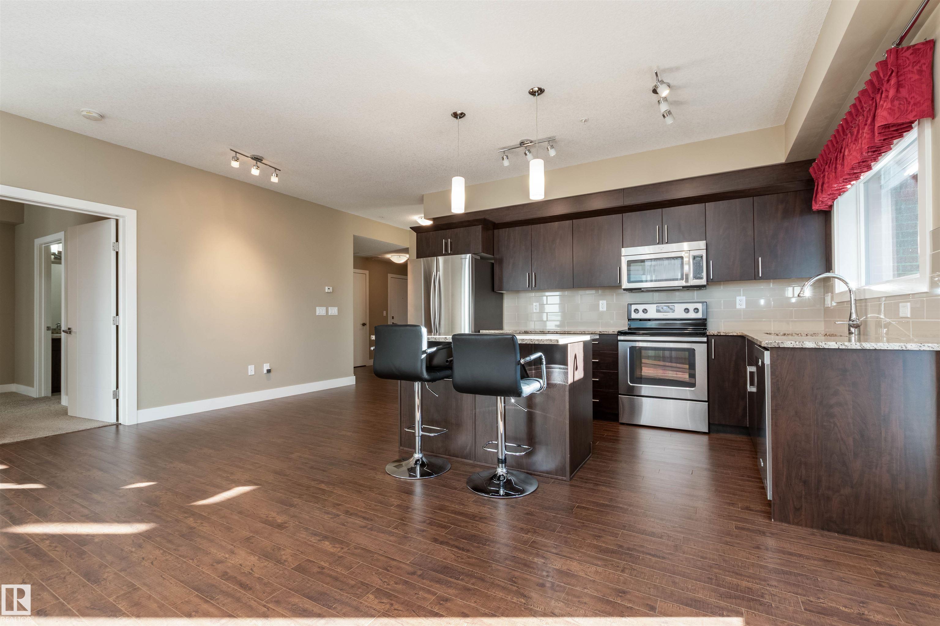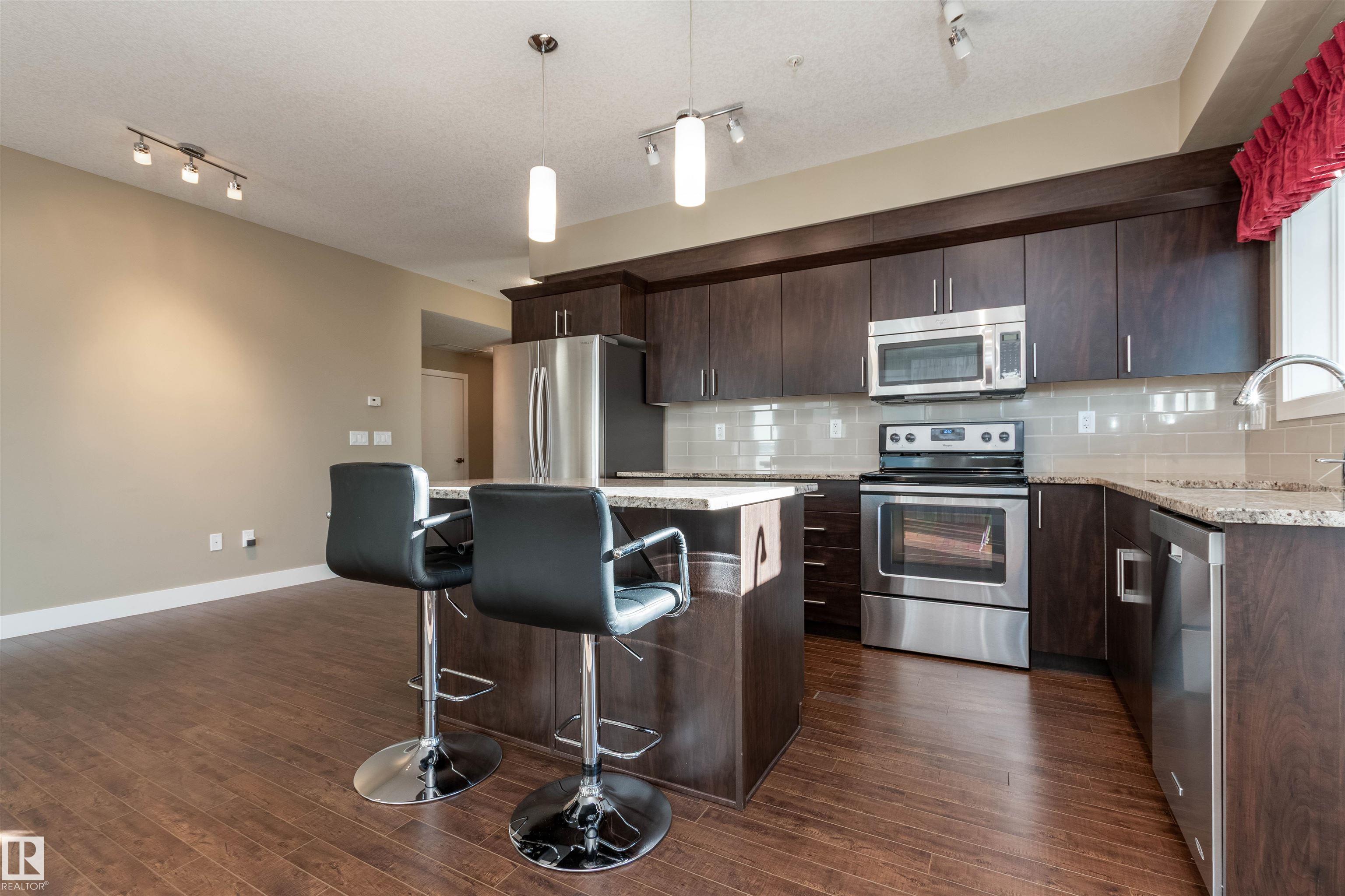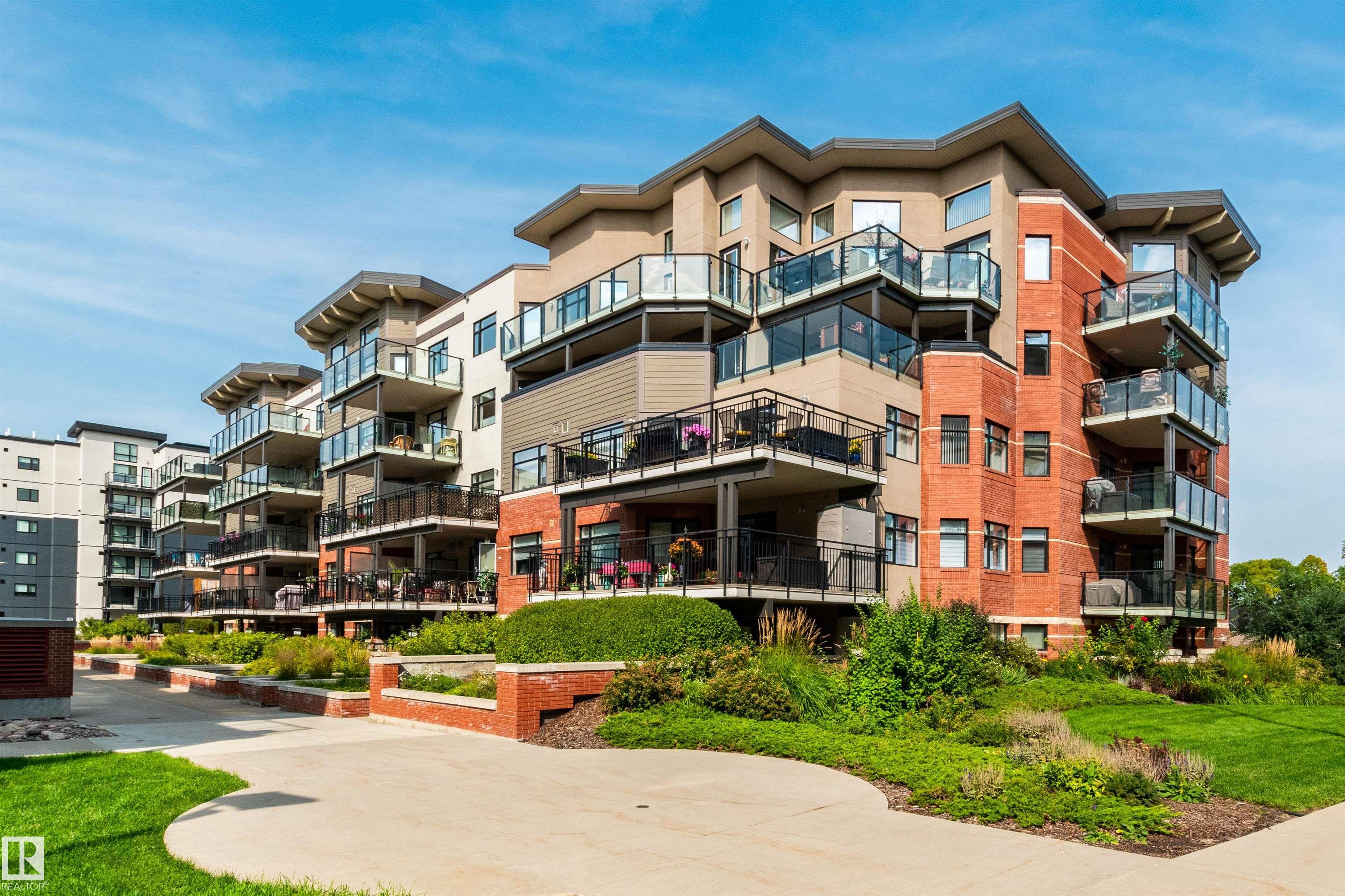 CORNER UNIT WITH SOUTHWEST EXPOSURE! Welcome to Reflections in Sherwood Park! This spacious and bright condo features an open floor plan with 1025 square feet. 2 Bedrooms and 2 bathrooms. Beautiful and modern kitchen with gorgeous granite counter tops, island, all appliances plus a large dining area. Living room with laminate flooring, and 2 BALCONIES to enjoy the sunny views! Lovely 3 piece ensuite and walk-in closet in the Primary Bedroom. Full 4 piece bathroom. Convenient in-suite laundry with stacked washer & dryer. AIR-CONDITIONING via heat pump. One UNDERGROUND TITLED PARKING STALL and assigned storage cage plus a car wash. Condo fees include professional management, heat and water. Exercise room is on the main level. Prime location just steps to Festival Place, Broadmoor Lake, The Library, restaurants and various amenities including the Sherwood Park Mall. Immediate possession is available! Visit REALTOR© website for information.