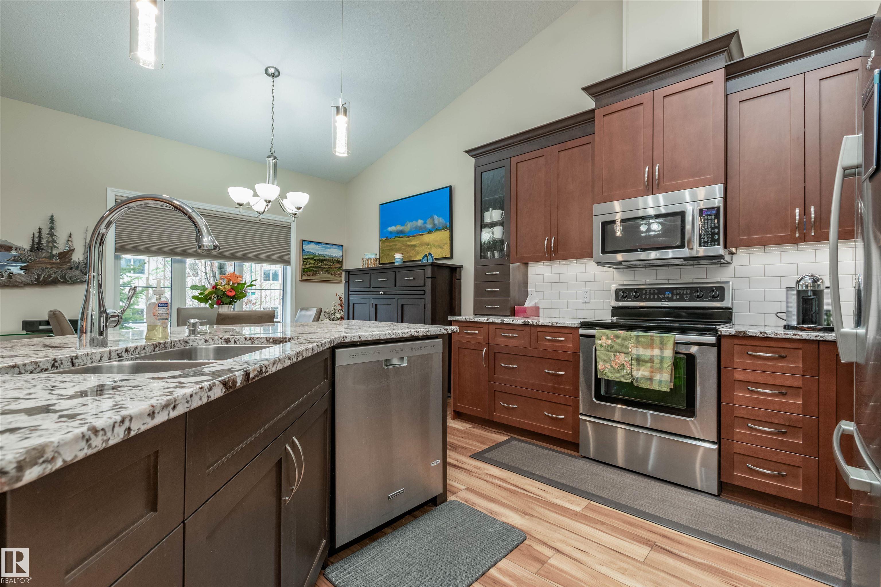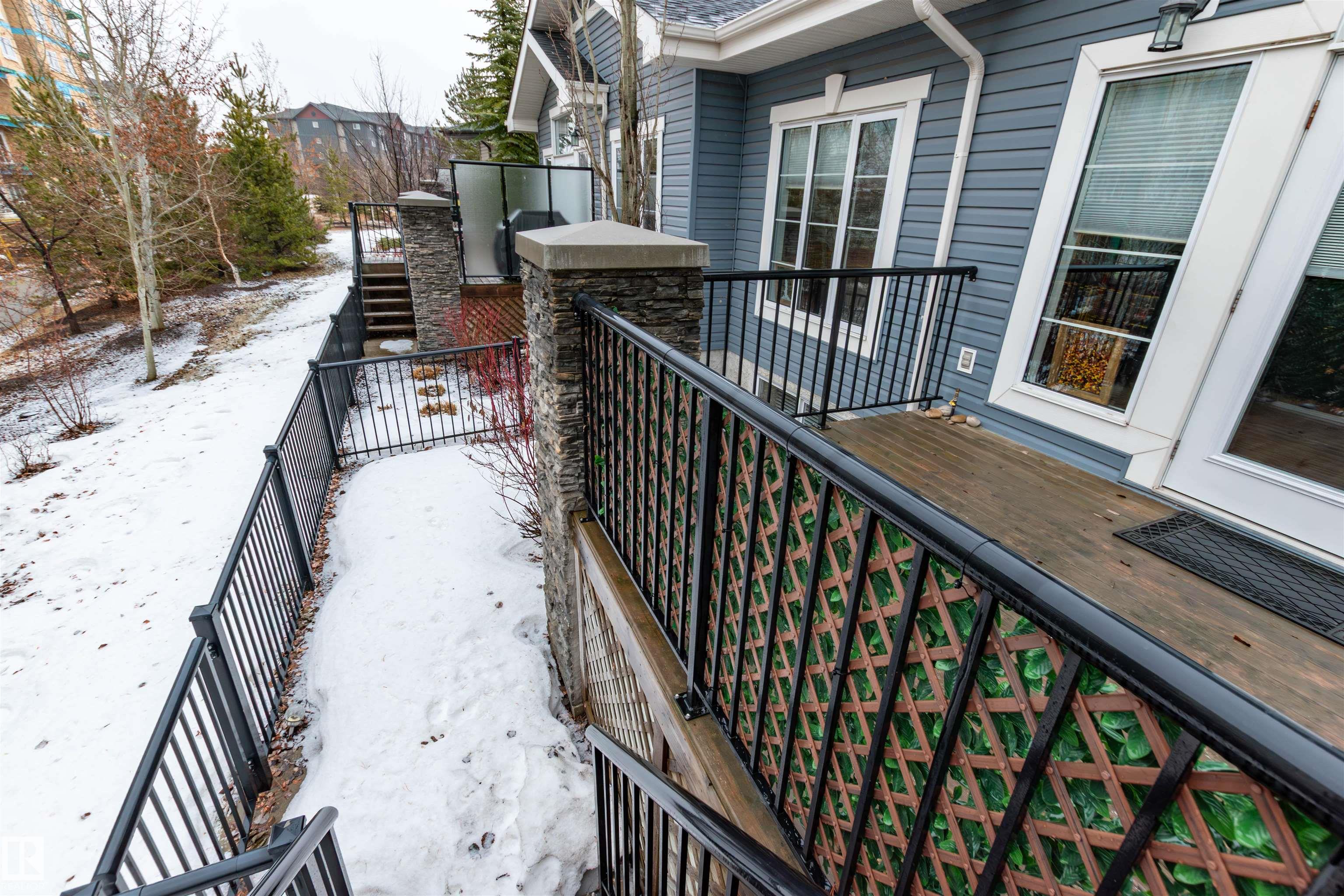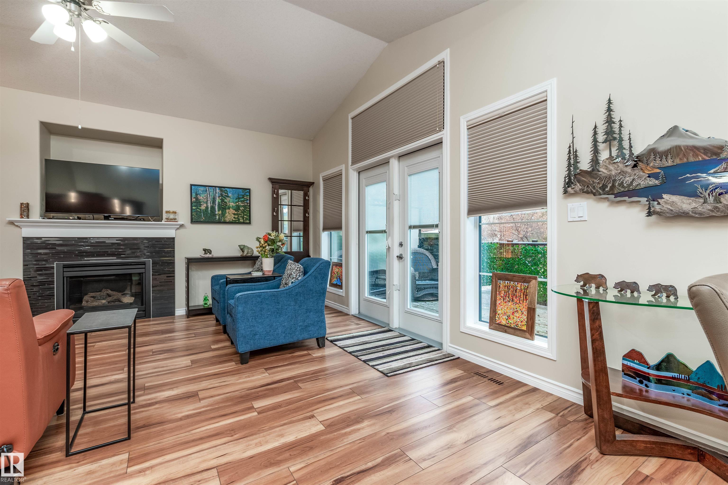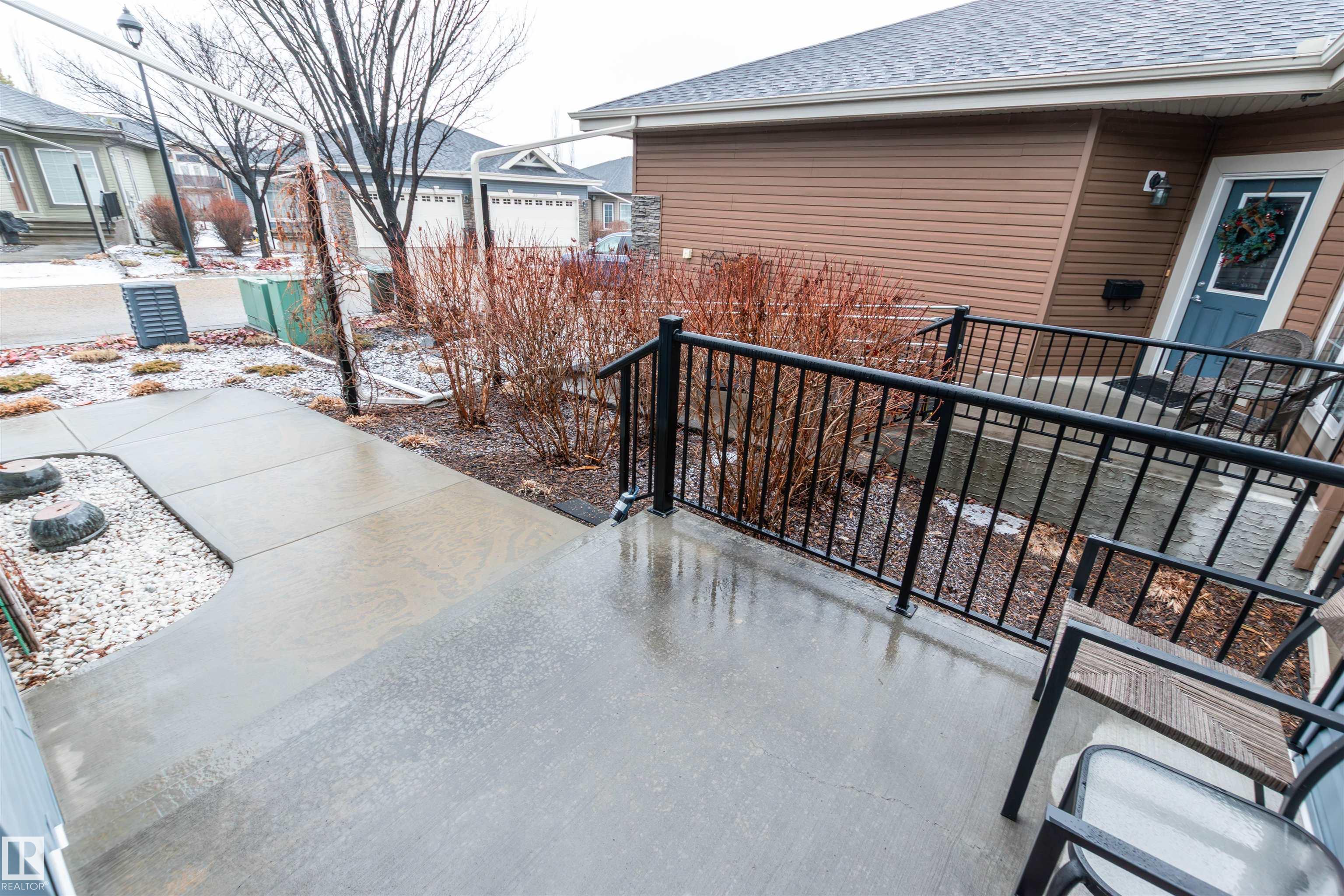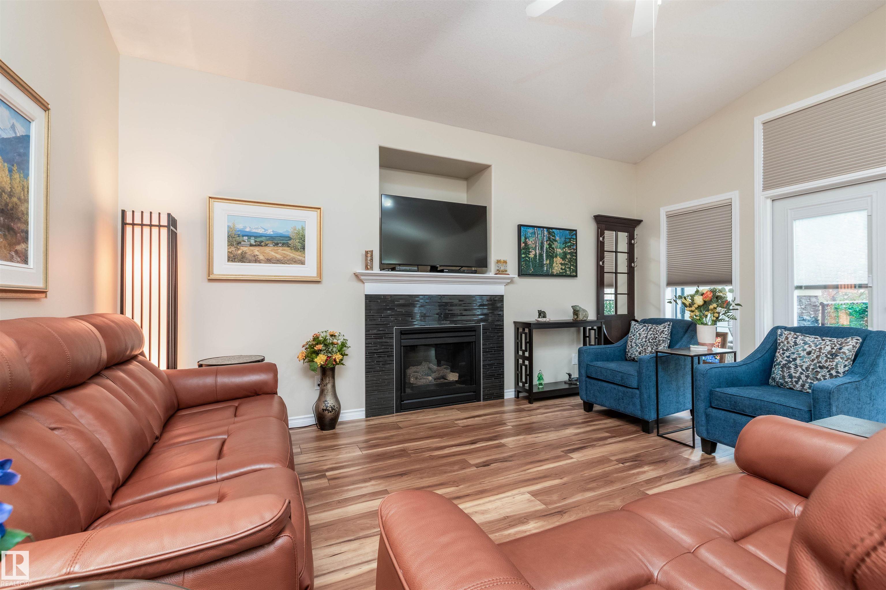 45+ Retirement Community in the heart of Emerald Hills! A/C, triple pane windows and fenced yard! Main floor features vaulted ceilings; spacious open-concept living/dining area w/gas fireplace. Kitchen includes a breakfast bar, espresso shaker-style cabinets, full pantry, & eat-in area leading out to deck. Primary suite features dble closets with custom built-ins; and a 4-pce ensuite including a soaker tub and separate stand-up shower. Also on main floor:separate laundry room with storage and hanging rack;an office/den space; double garage-drywalled and painted. Exterior lighting on house. Basement has open living area; 4-pc bath; and a guest bedroom with double closets with shelving,plumbed for wet bar area. A south facing front porch and north facing deck overlook mature trees and perennial landscaping. Condo fees cover snow removal, yard maintenance and window cleaning. Conveniently located within a 10 min walk of playgrounds, Italian Centre Shop, Hospital, restaurants, pharmacy, grocery, & shopping.