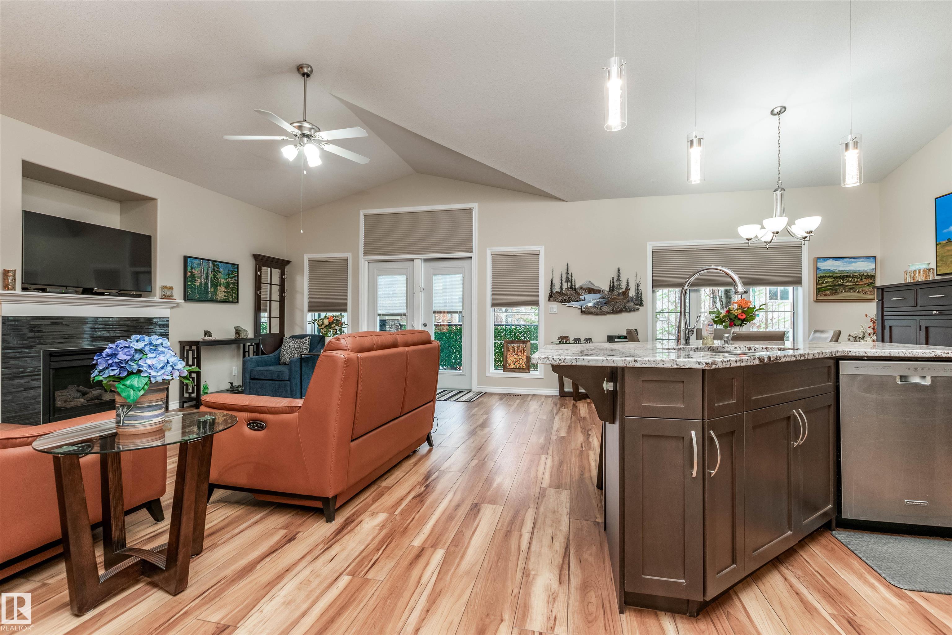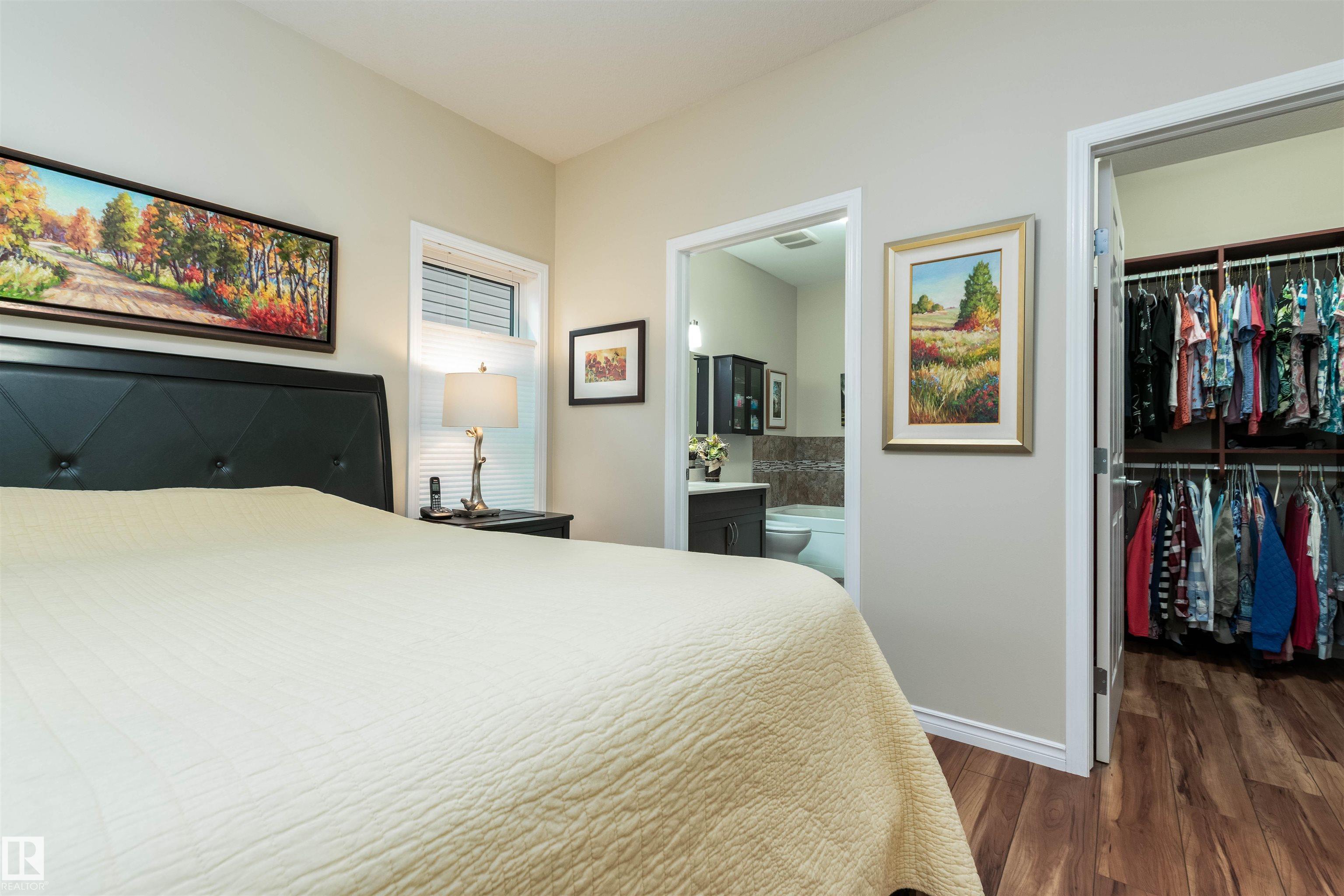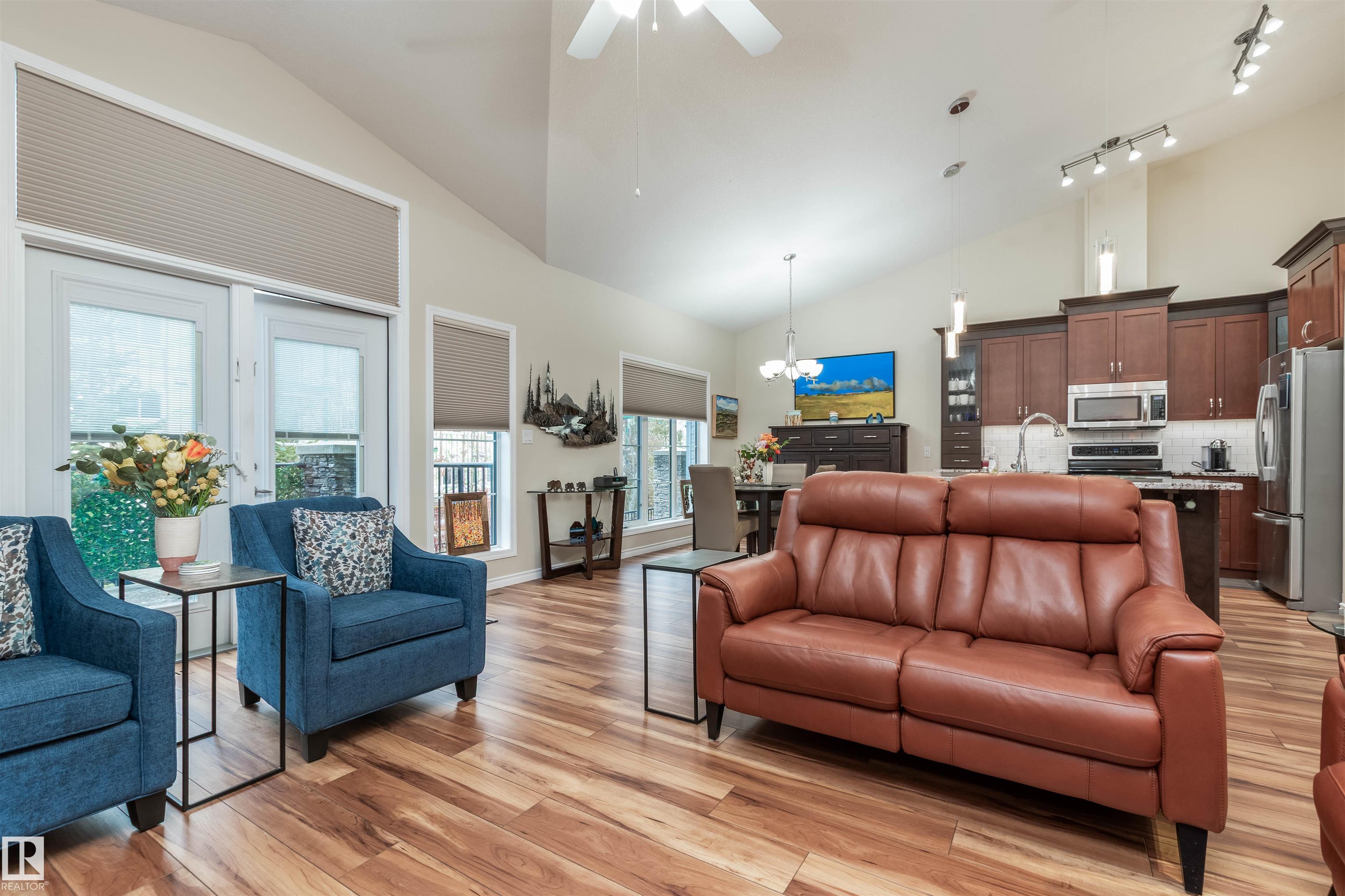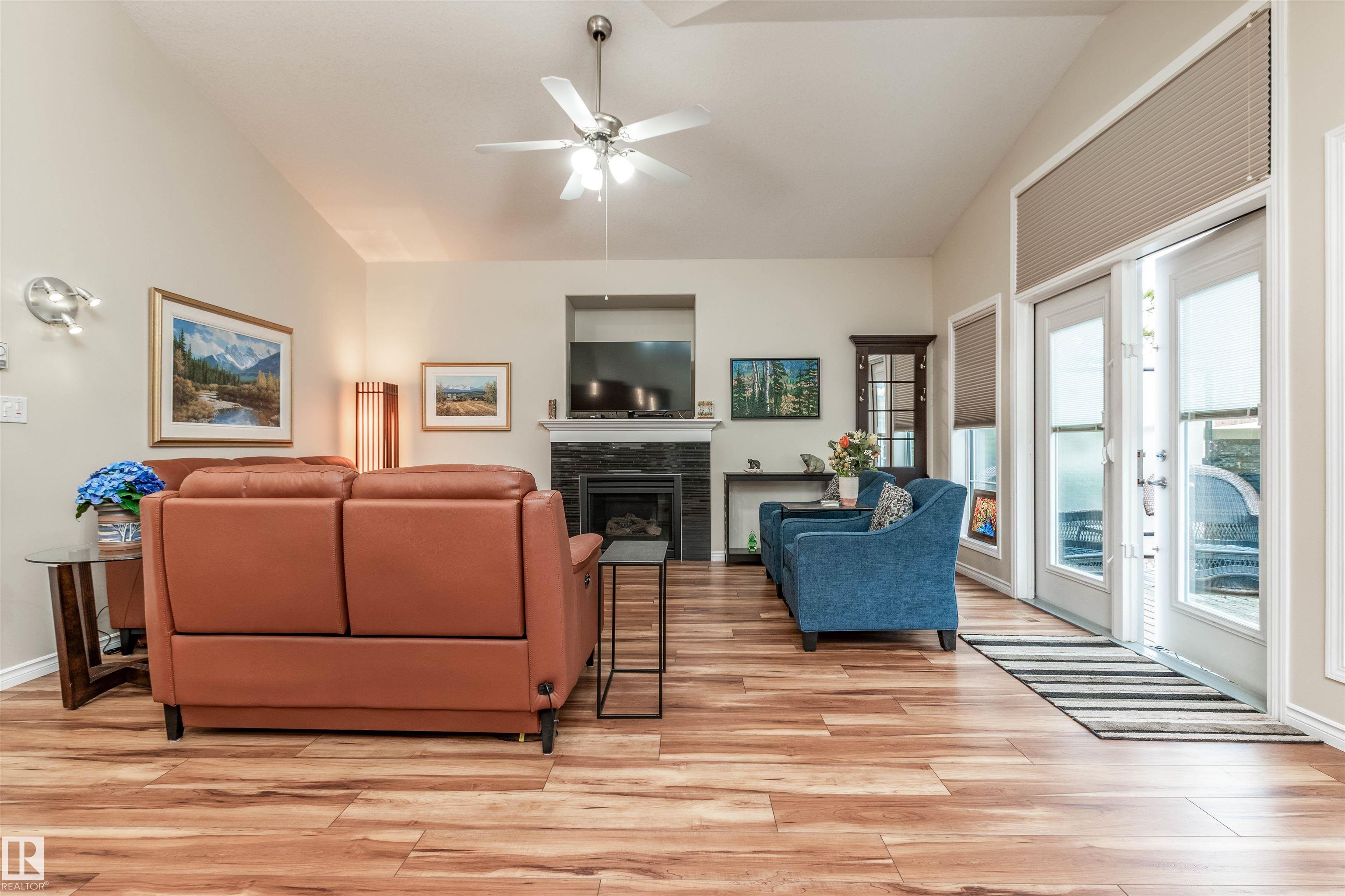 45+ Retirement Community in the heart of Emerald Hills! A/C, triple pane windows and fenced yard! Main floor features vaulted ceilings; spacious open-concept living/dining area w/gas fireplace. Kitchen includes a breakfast bar, espresso shaker-style cabinets, full pantry, & eat-in area leading out to deck. Primary suite features dble closets with custom built-ins; and a 4-pce ensuite including a soaker tub and separate stand-up shower. Also on main floor:separate laundry room with storage and hanging rack;an office/den space; double garage-drywalled and painted. Exterior lighting on house. Basement has open living area; 4-pc bath; and a guest bedroom with double closets with shelving,plumbed for wet bar area. A south facing front porch and north facing deck overlook mature trees and perennial landscaping. Condo fees cover snow removal, yard maintenance and window cleaning. Conveniently located within a 10 min walk of playgrounds, Italian Centre Shop, Hospital, restaurants, pharmacy, grocery, & shopping.